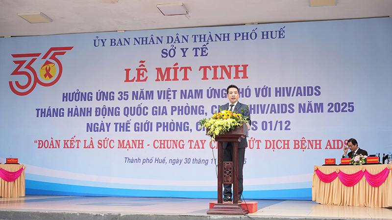 Ngày 30/11, tại Trung tâm Văn hóa Điện ảnh thành phố Huế, Sở Y tế thành phố Huế đã long trọng tổ chức Lễ Mít tinh hưởng ứng Tháng hành động quốc gia phòng, chống HIV/AIDS và Ngày Thế giới phòng, chống AIDS năm 2025. Tham dự buổi lễ có đồng chí Trần Hữu Thùy Giang, Phó Chủ tịch UBND thành phố Huế. Về phía Sở Y tế có sự hiện diện PGS.TS Trần Kiêm Hảo – Giám đốc Sở Y tế. Ngoài ra còn có sự hiện diện của đại diện Văn phòng Thành ủy, HĐND, UBND thành phố; các đồng chí Phó Giám đốc Sở Y tế; các sở, ban, ngành, đoàn thể; lãnh đạo 09 Trung tâm Y tế; cán bộ y tế, lực lượng vũ trang, phụ nữ, đoàn viên thanh niên, sinh viên các trường đại học, cao đẳng trên địa bàn thành phố Huế cùng đông đảo người dân.