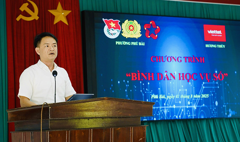 Sáng 1/8, tại nhà văn hóa tổ dân phố 1A, Đoàn phường Phú Bài phối hợp với các đơn vị: Công an, Trung tâm phục vụ hành chính công, Trung tâm sự nghiệp công lập phường và Viettel Hương Thủy tổ chức chương trình “Bình dân học vụ số” cho đội ngũ cán bộ thôn, tổ dân phố và người dân trên địa bàn. Tham dự có đồng chí Nguyễn Văn Phú, Phó Bí thư Thường trực Đảng ủy phường; đồng chí Nguyễn Thị Mỹ Nhung - UVTV Đảng ủy, Phó Chủ tịch HĐND phường; đồng chí Phan Hữu Sơn - UVTV Đảng ủy, Phó Chủ tịch UBND phường.