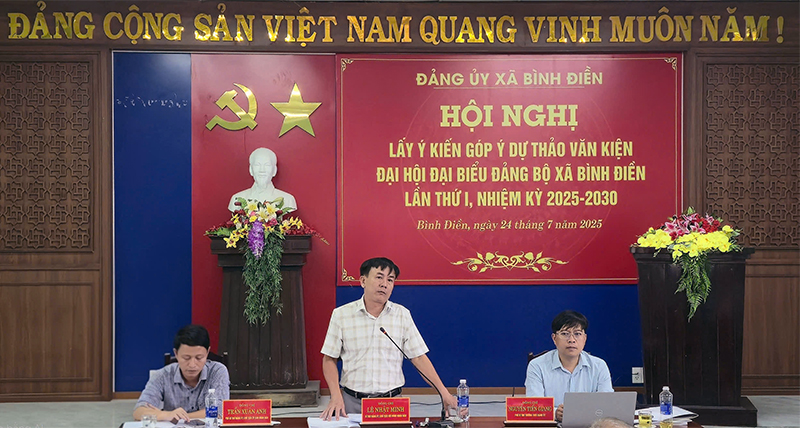 Ngày 24/7, tại Hội trường cơ quan Đảng ủy, Đảng ủy xã Bình Điền đã tổ chức Hội nghị lấy ý kiến góp ý dự thảo văn kiện Đại hội đại biểu Đảng bộ xã lần thứ I, nhiệm kỳ 2025 – 2030. Đồng chí Lê Nhật Minh - Bí thư Đảng ủy, Chủ tịch HĐND xã cùng các đồng chí trong Thường trực Đảng ủy xã chủ trì Hội nghị; tham dự Hội nghị có các đồng chí nguyên lãnh đạo các xã Bình Thành, Bình Tiến, Hương Bình – những địa phương trước khi sáp nhập thành xã Bình Điền và lãnh đạo các ban, văn phòng Đảng ủy xã.