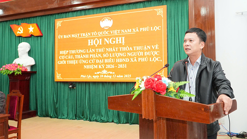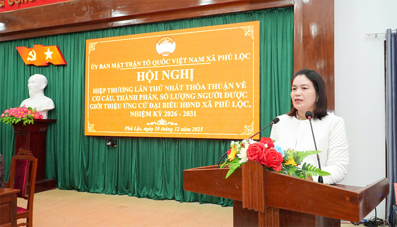 Ngày 10/12, Ban Thường trực Ủy ban Mặt trận Tổ quốc Việt Nam xã Phú Lộc tổ chức Hội nghị hiệp thương lần thứ nhất nhằm thỏa thuận về cơ cấu, thành phần và số lượng người được giới thiệu ứng cử đại biểu HĐND xã nhiệm kỳ 2026 – 2031. Tham dự hội nghị có đồng chí Cái Diệu Trang, Phó Bí thư Thường trực Đảng ủy, cùng các đồng chí trong Ban Thường vụ Đảng ủy.
