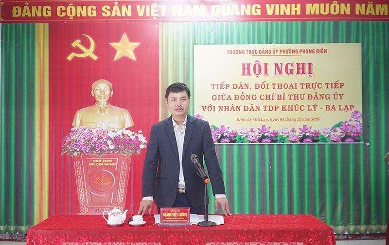 Sáng 4/12, đồng chí Hoàng Việt Cường, TUV, Bí thư Đảng uỷ, Chủ tịch HĐND phường Phong Điền đã có buổi tiếp dân, đối thoại trực tiếp với Nhân dân tổ dân phố Khúc Lý – Ba Lạp. Cùng dự buổi tiếp có Phó Chủ tịch UBND phường Trương Minh Phát cùng lãnh đạo UBKT Đảng ủy, UBMTTQVN phường, Văn phòng Đảng ủy, HĐND, UBND phường; các phòng chuyên môn UBND phường.