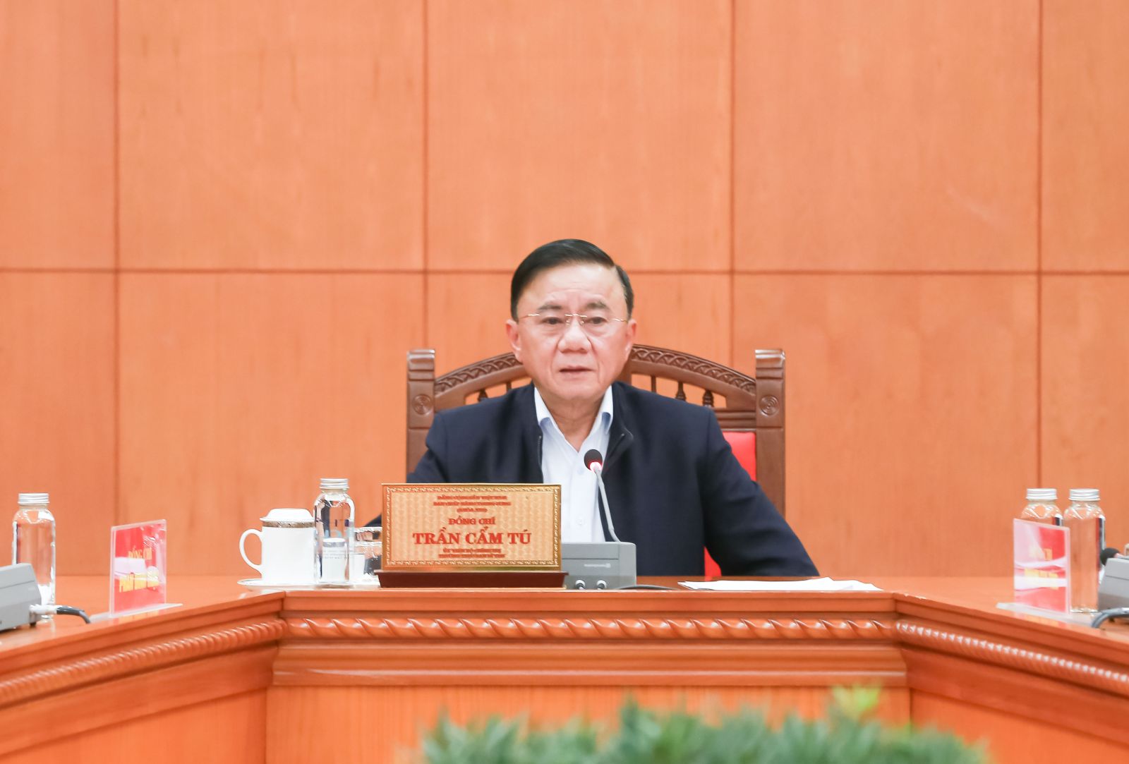 Đồng chí Trần Cẩm Tú, Ủy viên Bộ Chính trị, Thường trực Ban Bí thư, Trưởng Tiểu ban Tổ chức phục vụ Đại hội XIV của Đảng phát biểu tại cuộc làm việc.