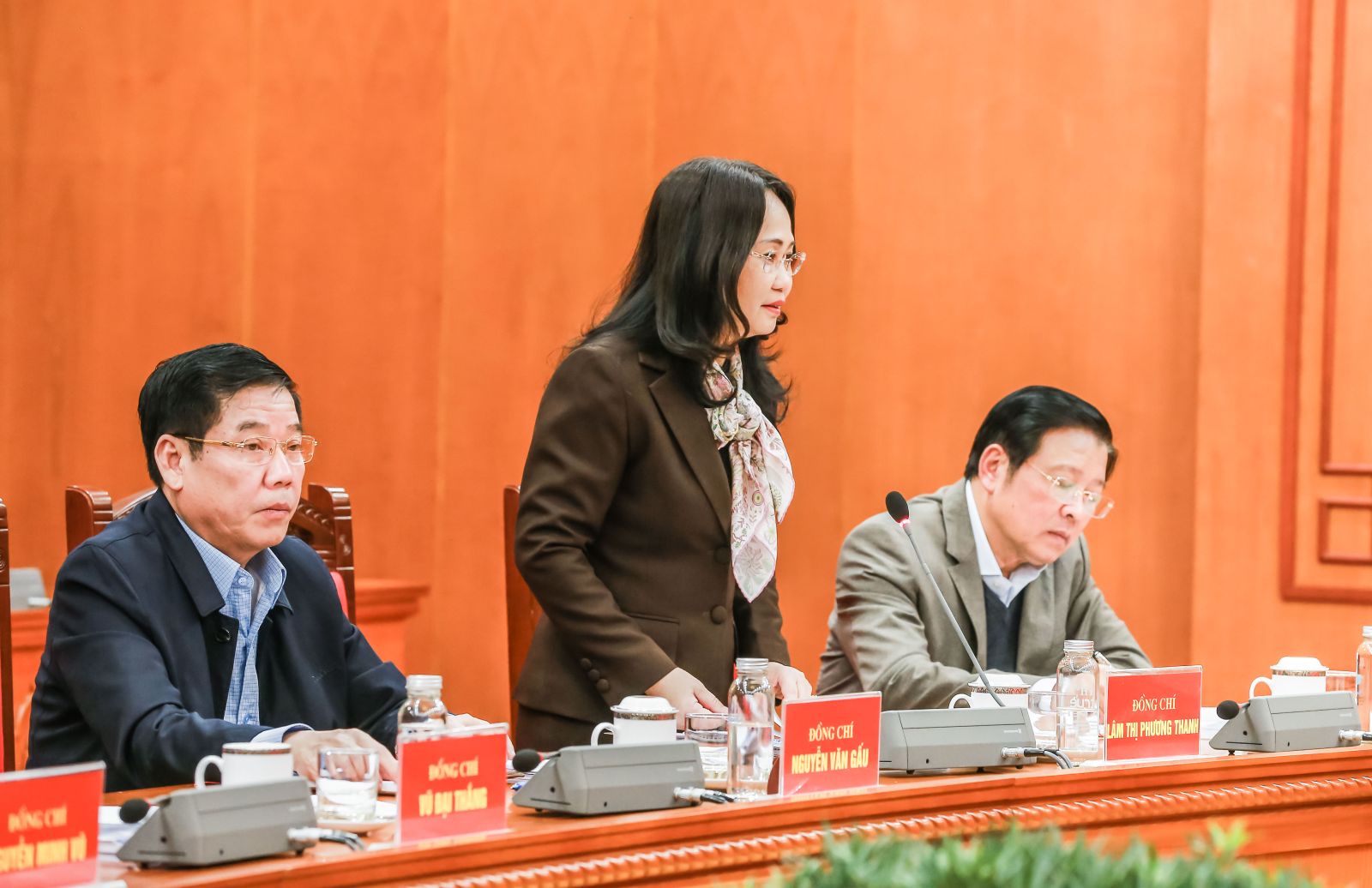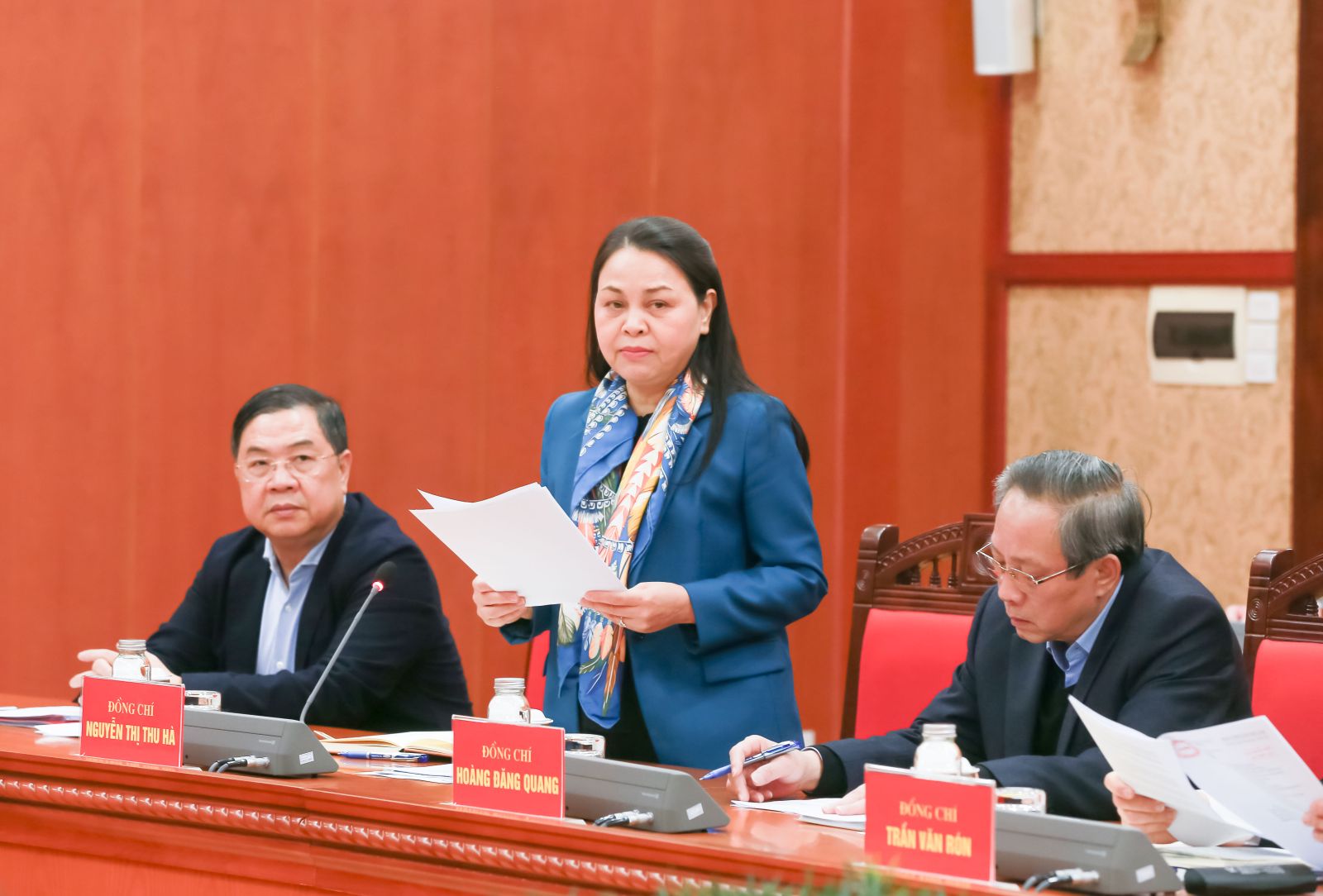 Đồng chí Nguyễn Thị Thu Hà, Ủy viên Trung ương Đảng, Phó Chánh Văn phòng Thường trực Văn phòng Trung ương Đảng báo cáo tại cuộc làm việc.