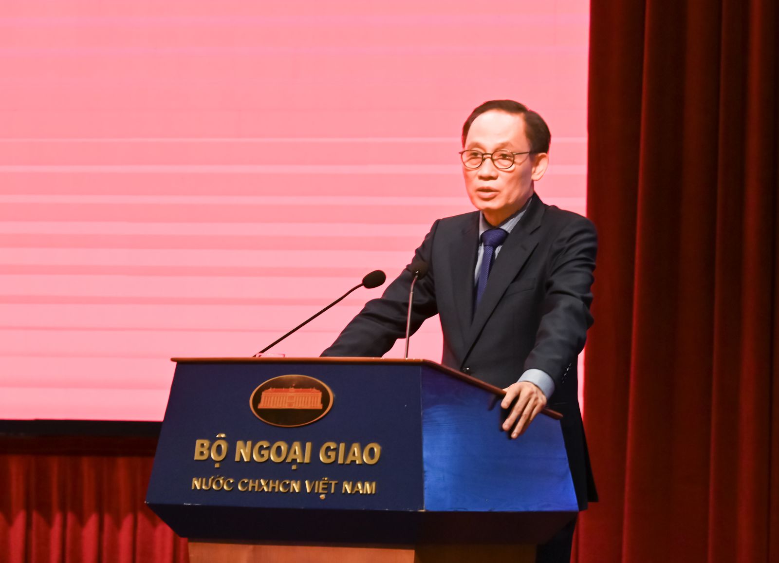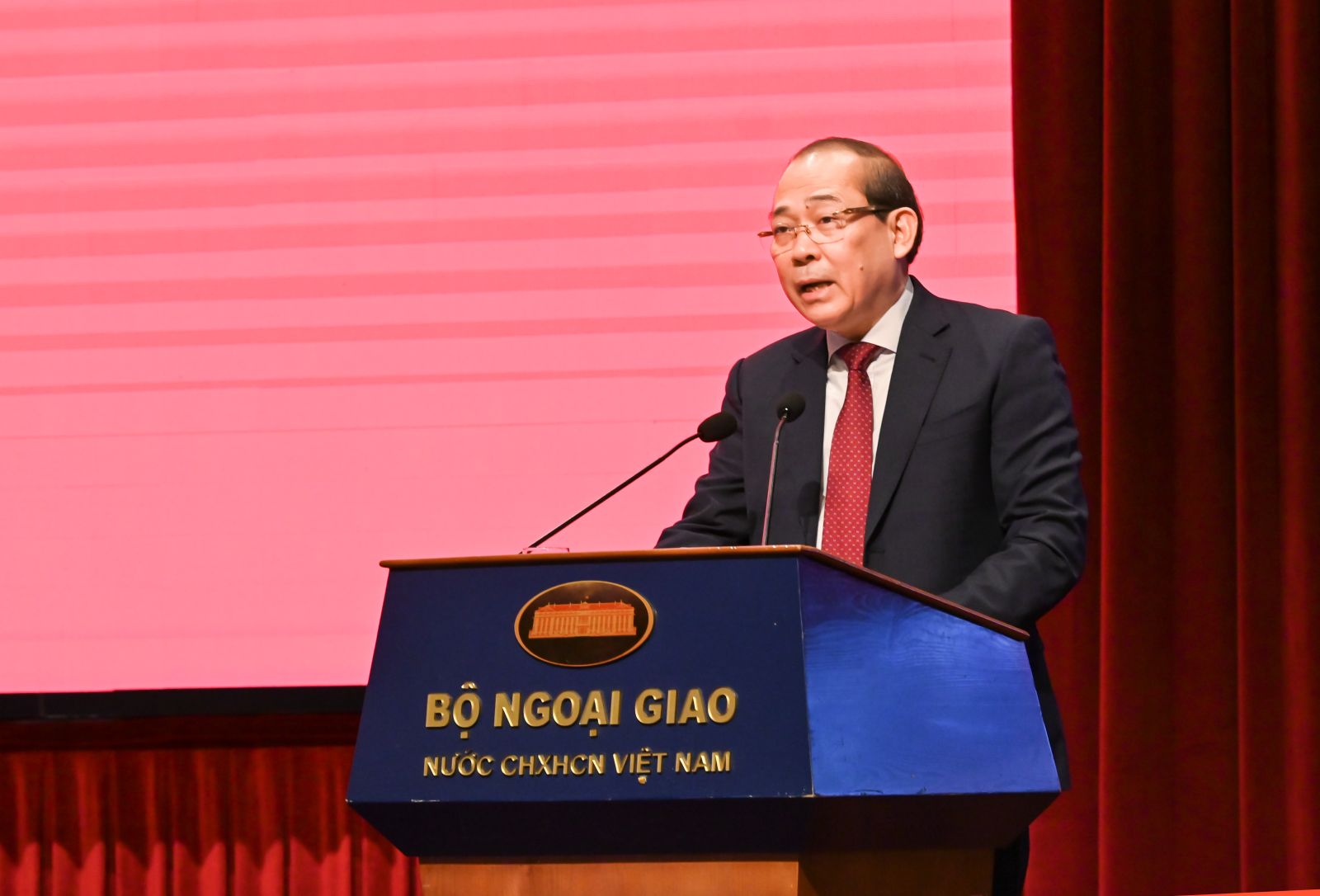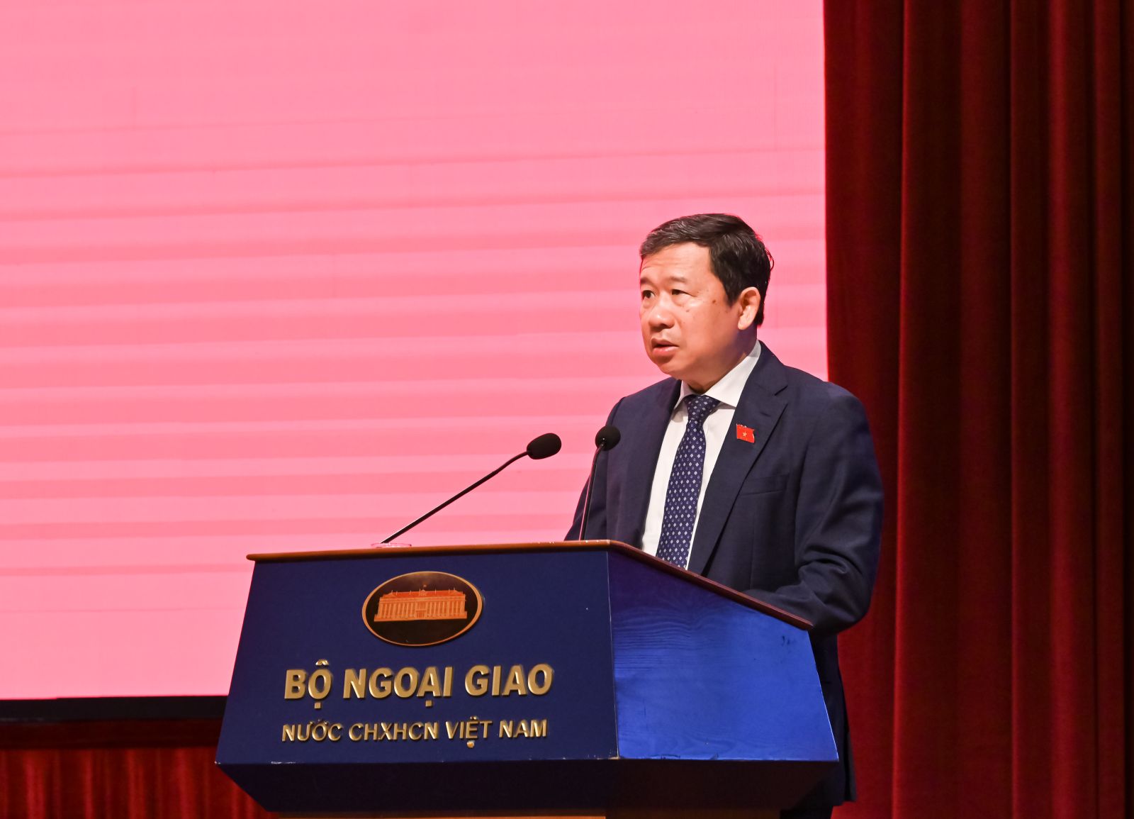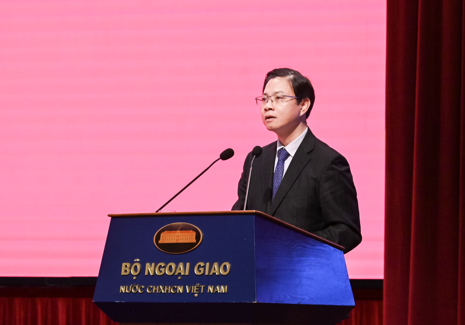 Đồng chí Lê Hoài Trung, Bí thư Trung ương Đảng, Bộ trưởng Bộ Ngoại giao phát biểu tại Hội nghị.