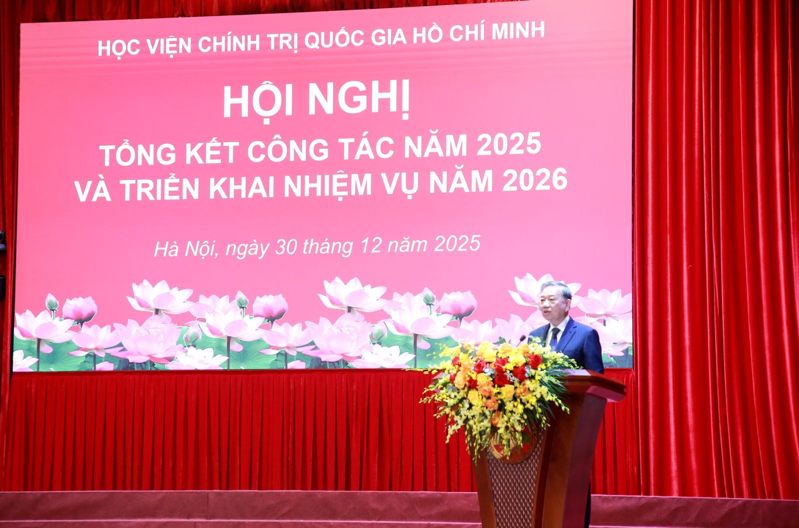 Tổng Bí thư Tô Lâm phát biểu chỉ đạo tại Hội nghị tổng kết năm 2025 tại Học viện Chính trị quốc gia Hồ Chí Minh.