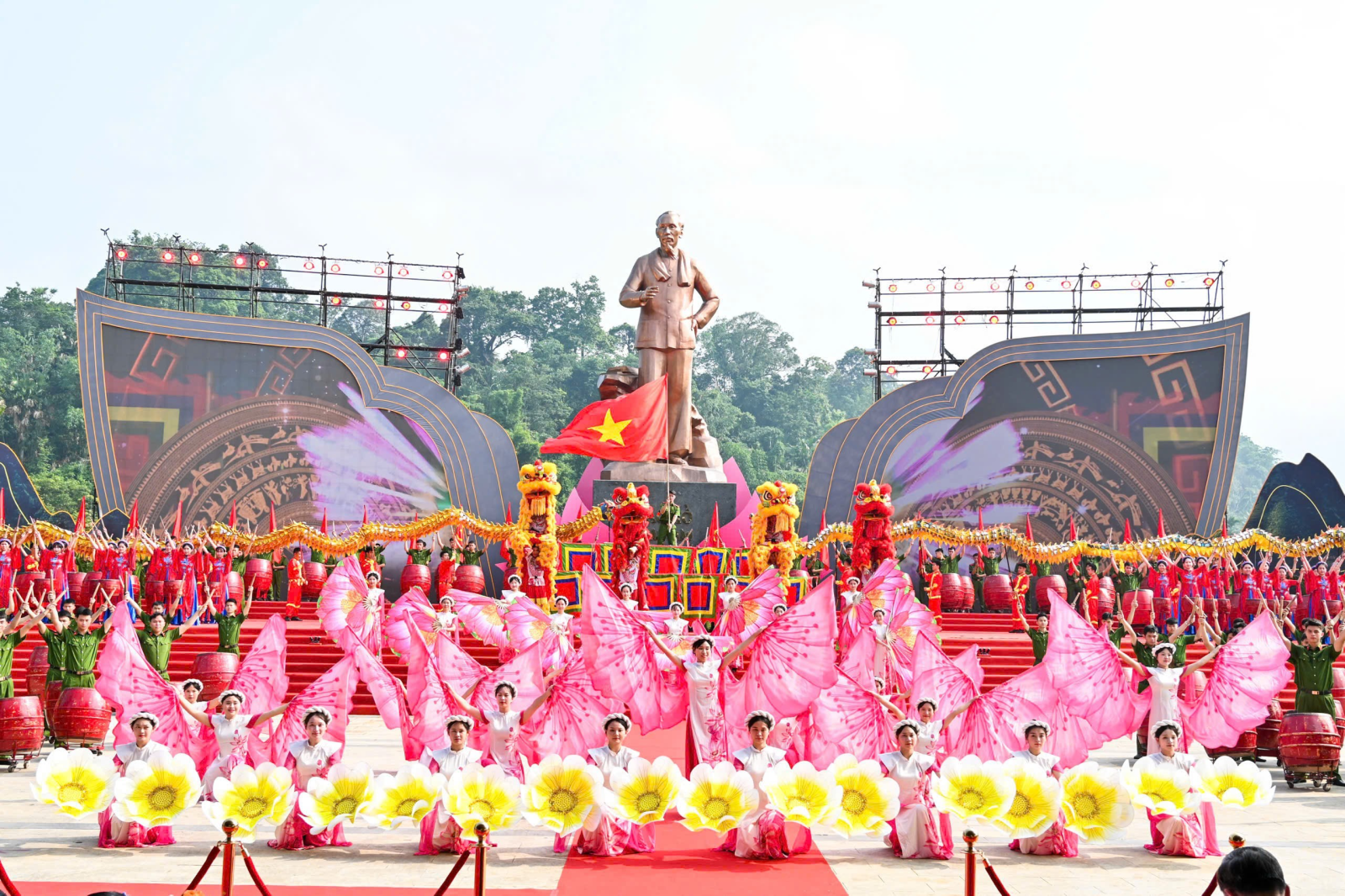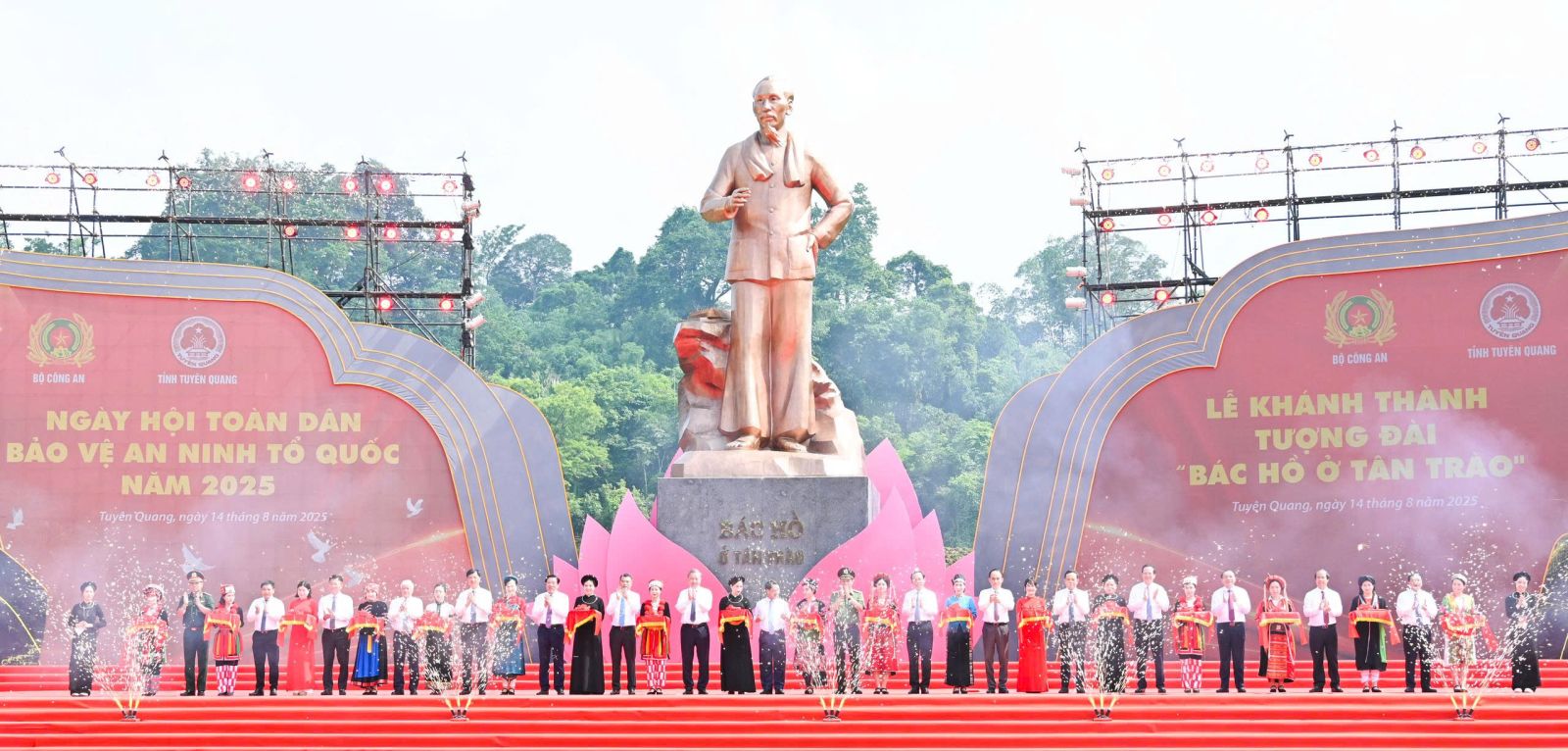 Tổng Bí thư và các đồng chí Lãnh đạo cắt băng khánh thành tượng đài "Bác Hồ ở Tân Trào".