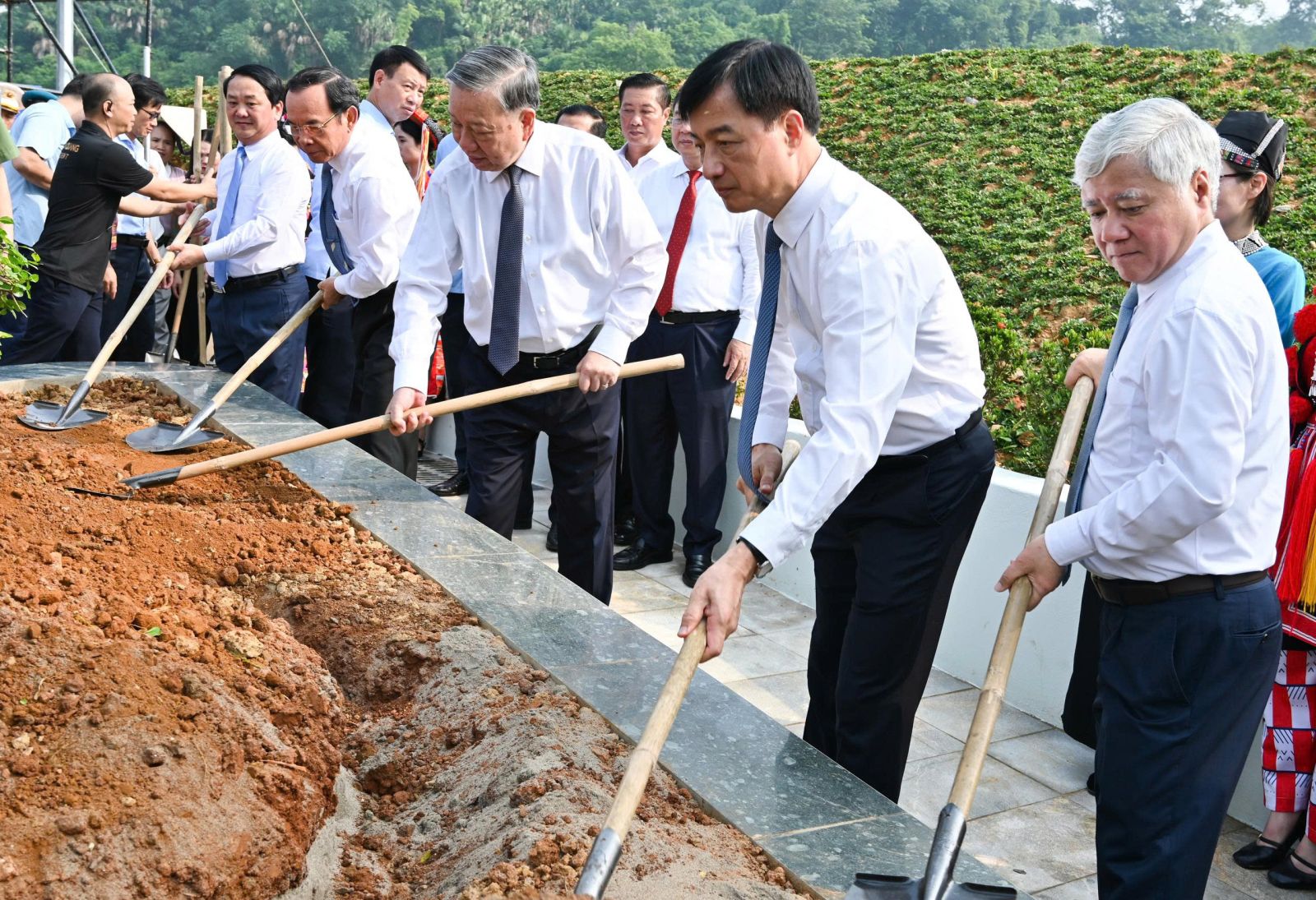 Tổng Bí thư Tô Lâm và Đoàn công tác trồng cây lưu niệm tại  khu di tích Tân Trào.