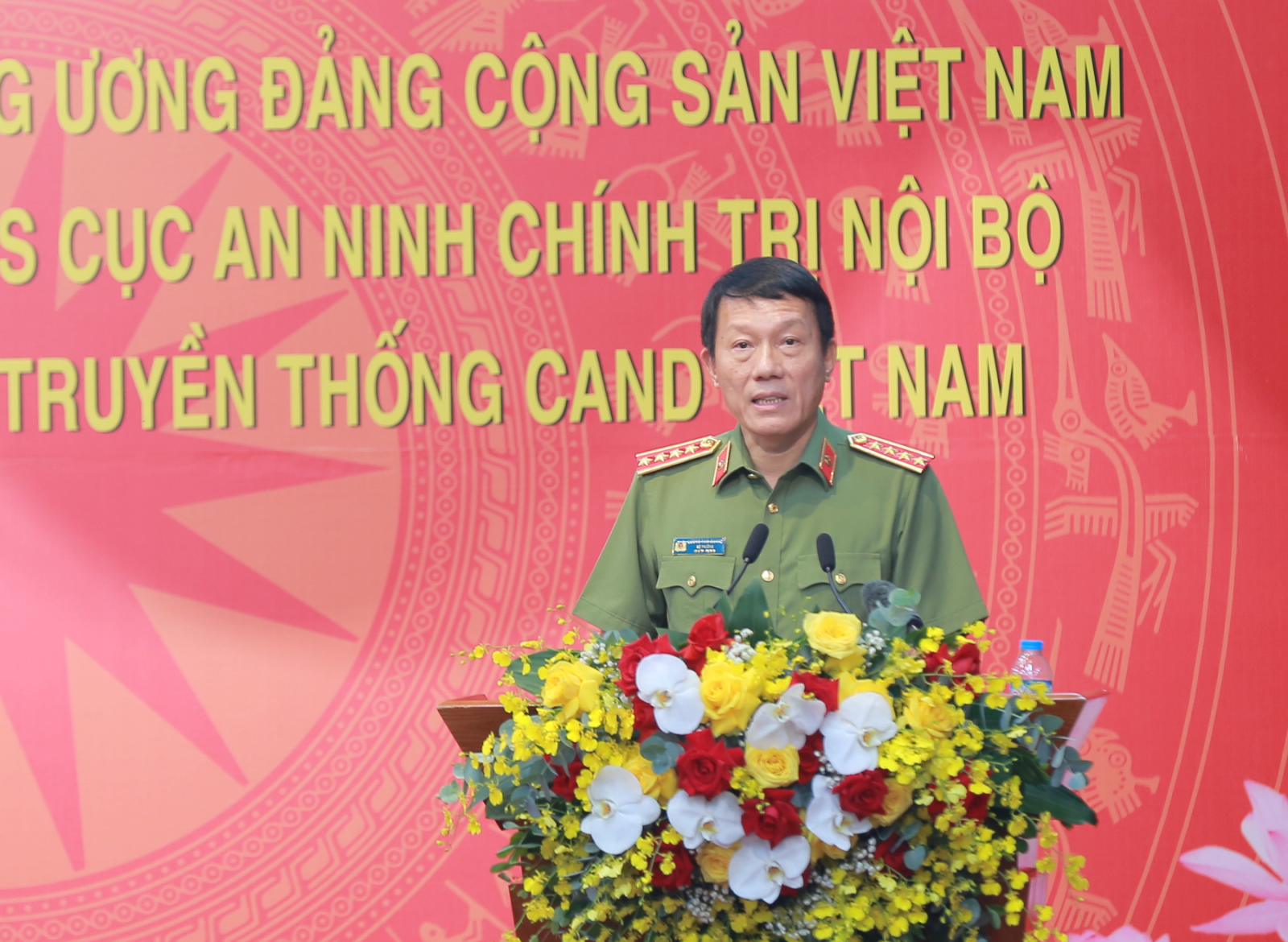 Ủy viên Bộ Chính trị, Bộ trưởng Bộ Công an Lương Tam Quang thay mặt lực lượng CAND nói chung và Cục Chính trị nội bộ đáp từ, tiếp thu các ý kiến chỉ đạo của đồng chí Tổng Bí thư tại buổi gặp mặt kỷ niệm.
