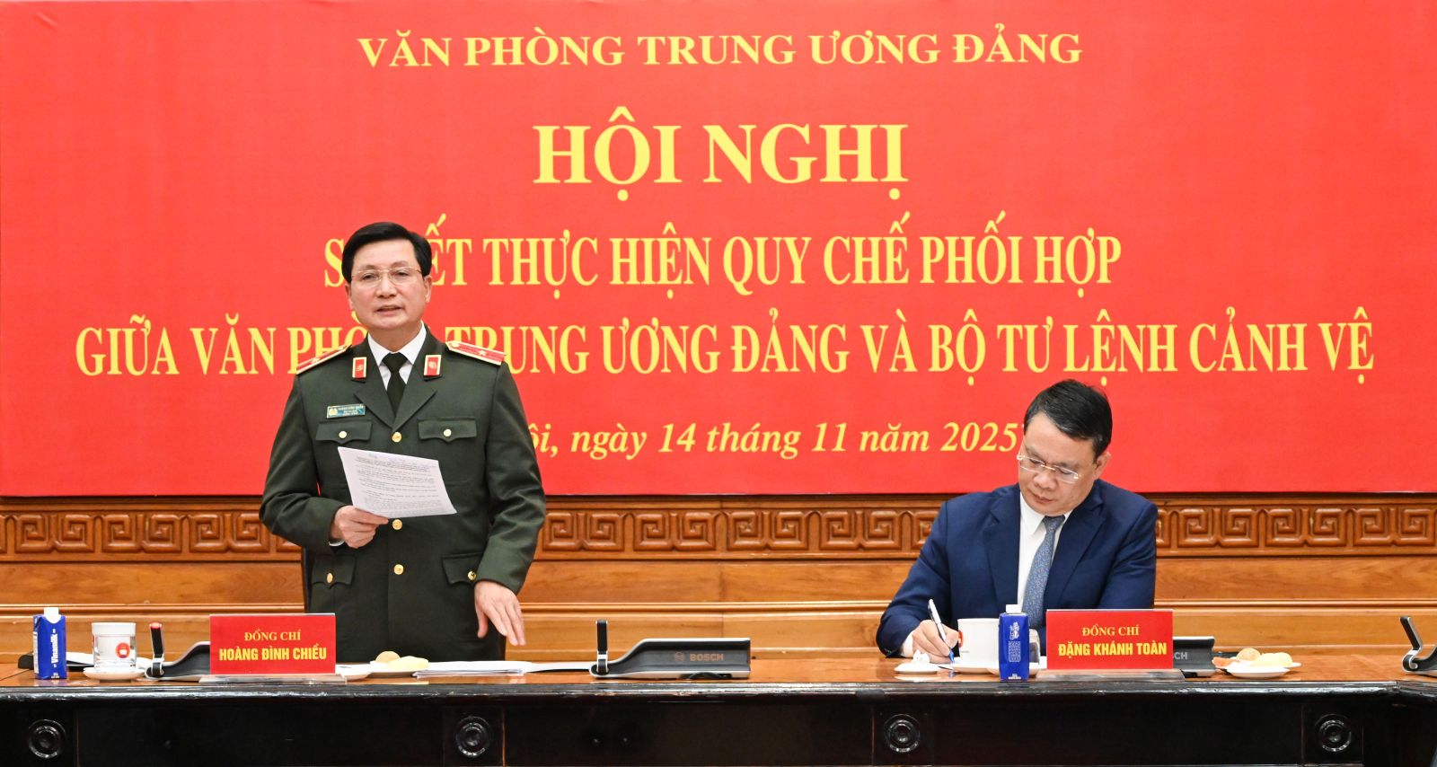 (ĐCSVN) - Chiều 14/11, Văn phòng Trung ương Đảng và Bộ Tư lệnh Cảnh vệ tổ chức Hội nghị sơ kết thực hiện Quy chế phối hợp giữa hai cơ quan. Đồng chí Đặng Khánh Toàn, Phó Bí thư Thường trực Đảng ủy, Phó Chánh Văn phòng Trung ương Đảng và đồng chí Thiếu tướng Hoàng Đình Chiều, Phó Tư lệnh Bộ Tư lệnh Cảnh vệ chủ trì Hội nghị.