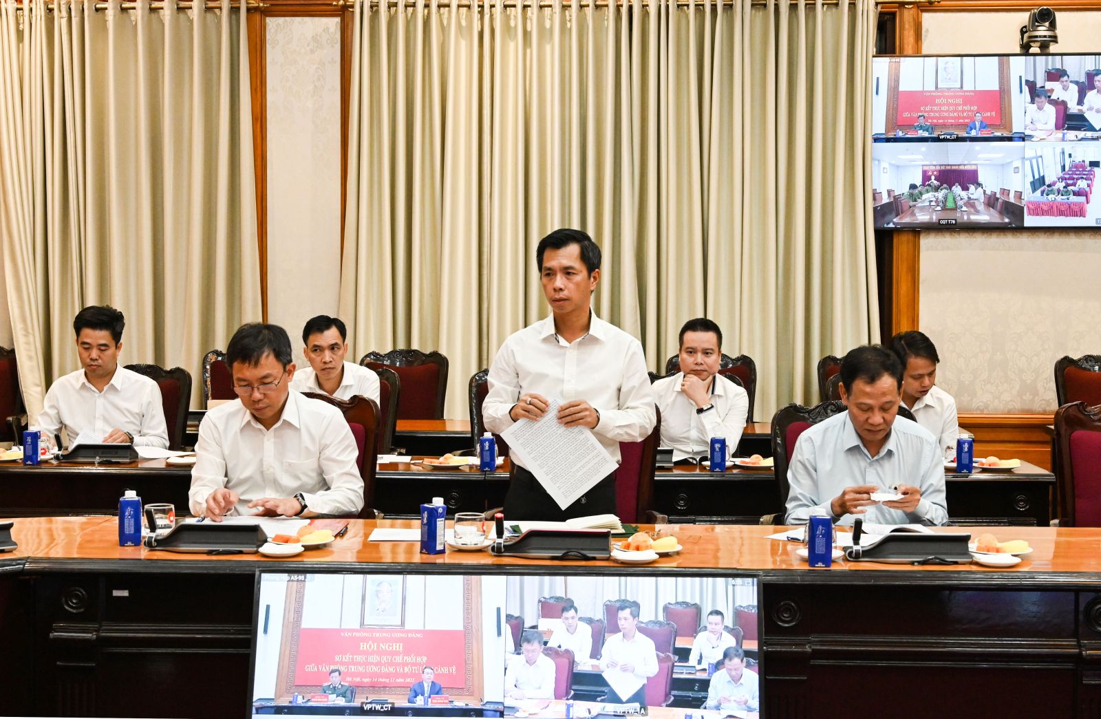 Tại Hội nghị, đồng chí Trần Quang Hiếu, Phó Cục trưởng Cục Quản trị (Văn phòng Trung ương Đảng) đã báo cáo những kết quả đạt được trong việc triển khai thực hiện Quy chế phối hợp giữa Văn phòng Trung ương Đảng và Bộ Tư lệnh Cảnh vệ, Bộ Công an trong công tác cảnh vệ (Quy chế số 01-QC/VPTW-BTLCV, ngày 01/3/2022).