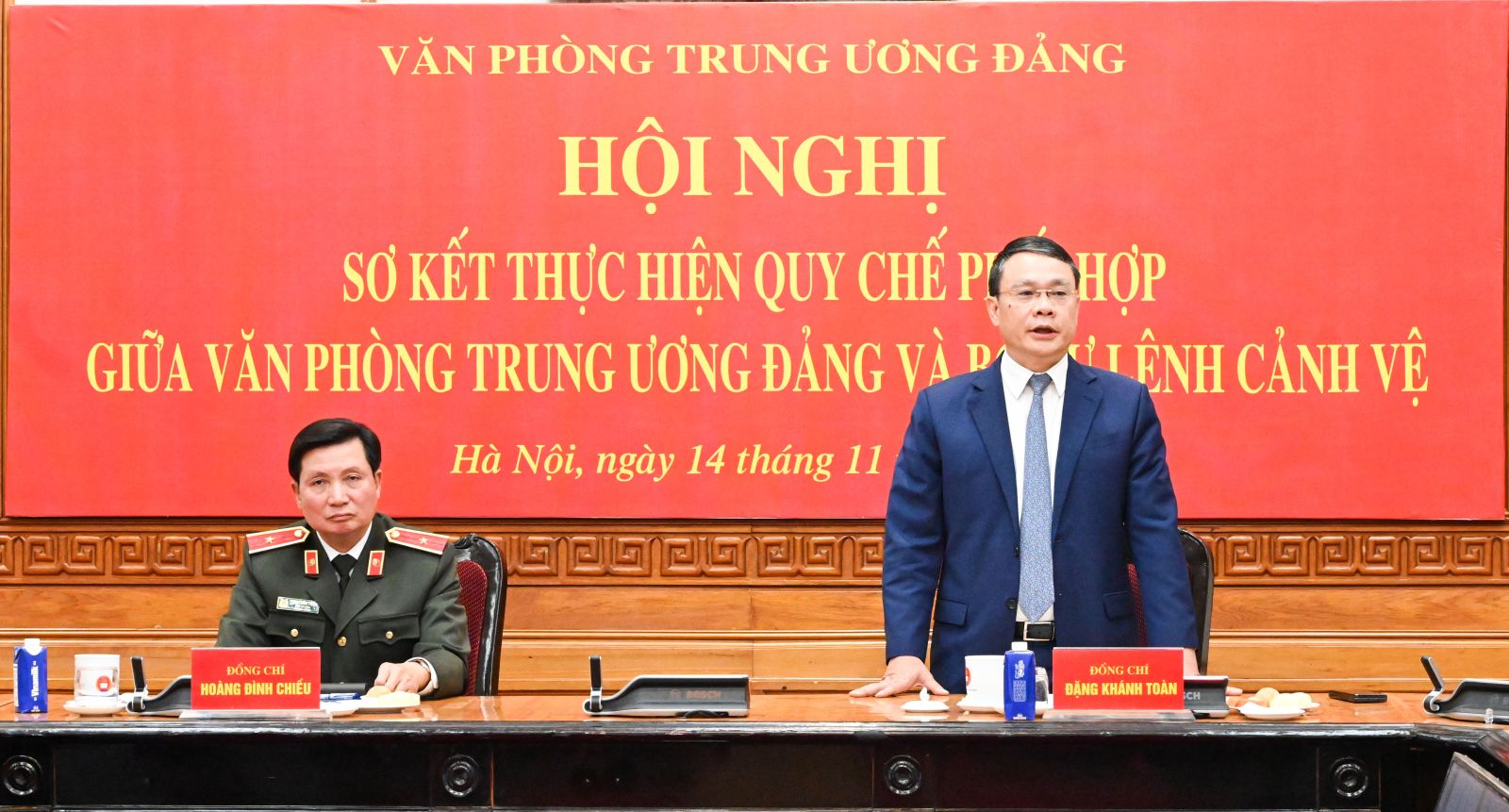 Kết luận Hội nghị, đồng chí Đặng Khánh Toàn, Phó Chánh Văn phòng Trung ương Đảng ghi nhận, biểu dương những kết quả đạt được trong công tác phối hợp giữa Văn phòng Trung ương Đảng và Bộ Tư lệnh Cảnh vệ thời gian qua; đồng thời thông tin, làm rõ một số vấn đề còn vướng mắc và đề nghị các vụ, đơn vị liên quan tiếp thu, tổng hợp đầy đủ các ý kiến để báo cáo, xin ý kiến lãnh đạo Văn phòng Trung ương Đảng và Bộ Tư lệnh Cảnh vệ xem xét, quyết định.