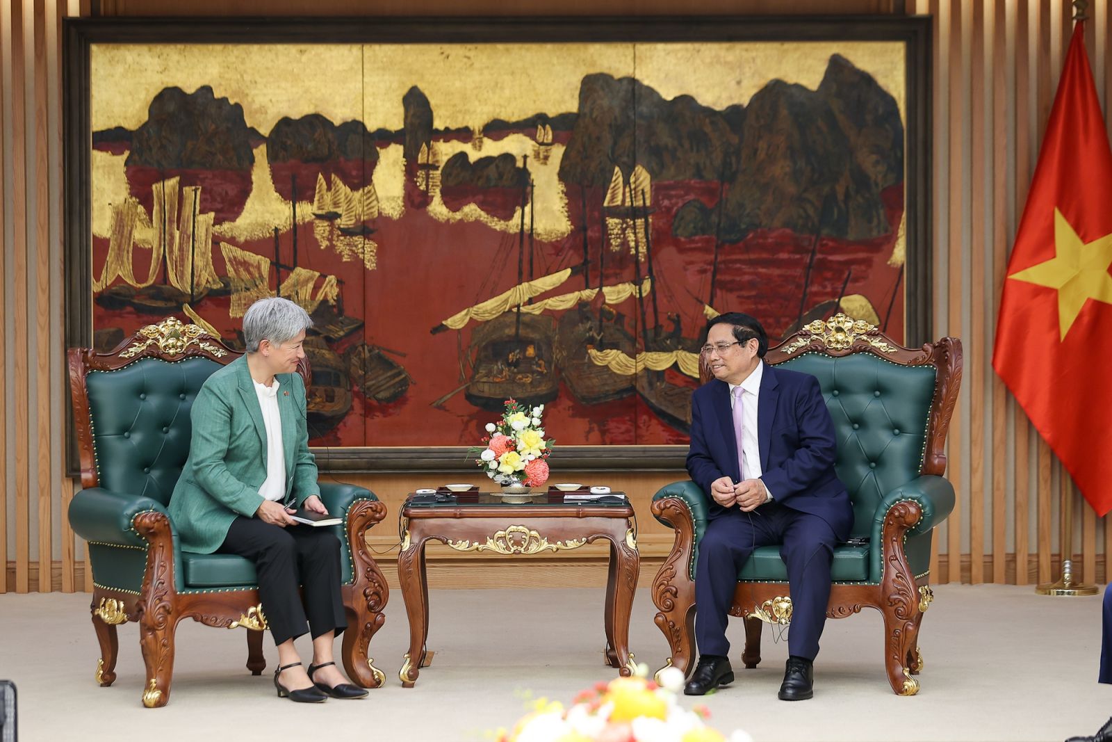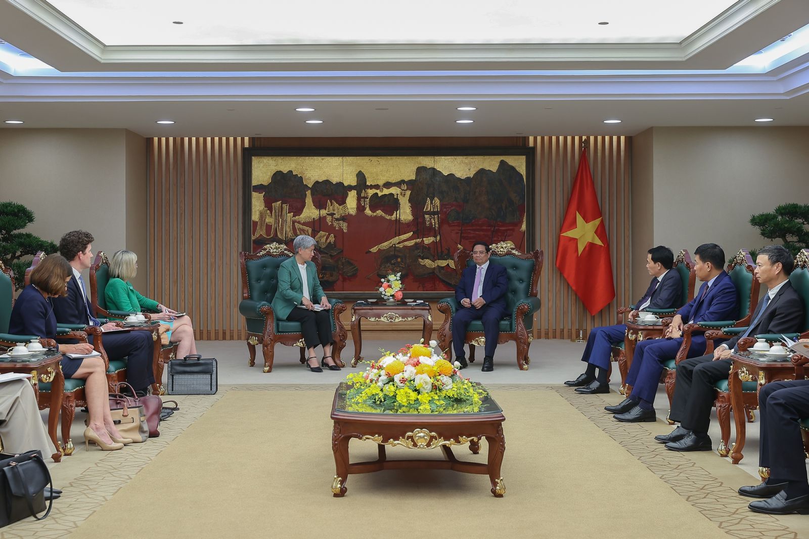 Bộ trưởng Ngoại giao Penny Wong chúc mừng Thủ tướng Chính phủ và bày tỏ vinh dự thăm Việt Nam đúng dịp Việt Nam đang chuẩn bị cho Lễ kỷ niệm 80 năm thành lập nước. Bộ trưởng cho rằng, đây là thời điểm quan trọng để hai nước cùng nhìn lại lịch sử và định hình hợp tác trong tương lai; khẳng định Chính phủ Australia rất coi trọng vai trò của Việt Nam ở khu vực cũng như quan hệ Việt Nam - Australia và mong muốn trao đổi các biện pháp để đưa quan hệ hai nước phát triển sâu rộng hơn nữa. Bộ trưởng Penny Wong nhấn mạnh, hai nước chia sẻ nhiều quan điểm, tầm nhìn chung về các vấn đề song phương cũng như khu vực và quốc tế, là nền tảng để gia tăng hơn nữa hợp tác và sự ủng hộ lẫn nhau.