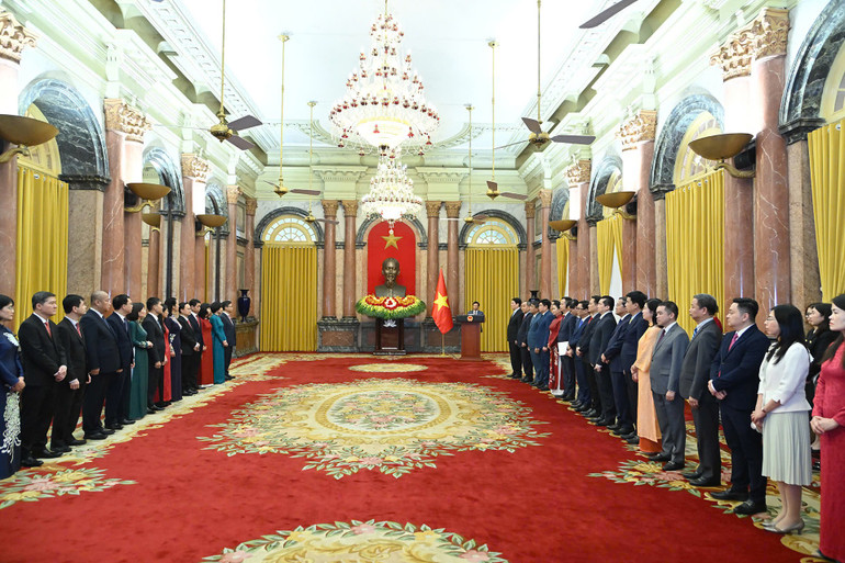 Chủ tịch nước Lương Cường trao quyết định bổ nhiệm Đại sứ Việt Nam tại nước ngoài. (Ảnh: Thủy Nguyên)