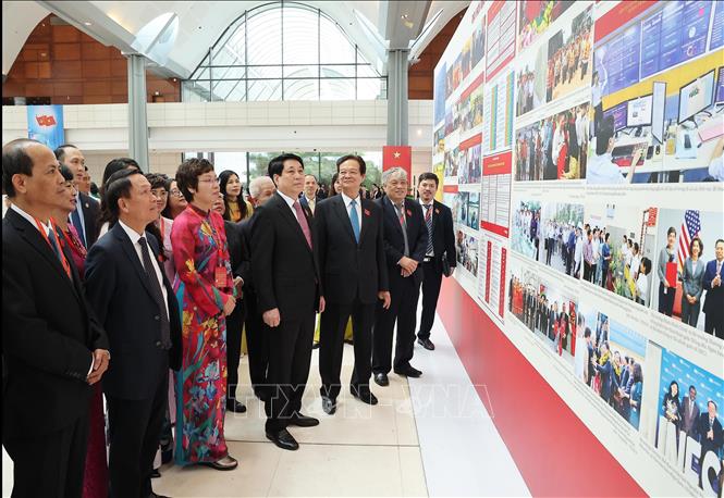 Chủ tịch nước Lương Cường, nguyên Thủ tướng Nguyễn Tấn Dũng tham quan triển lãm ảnh. Ảnh: TTXVN