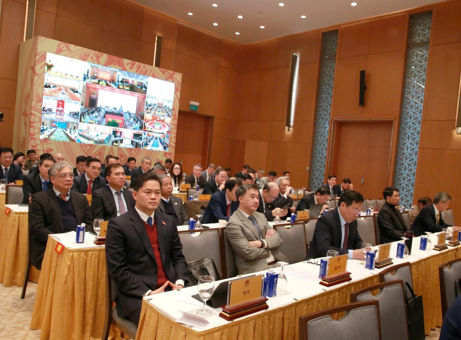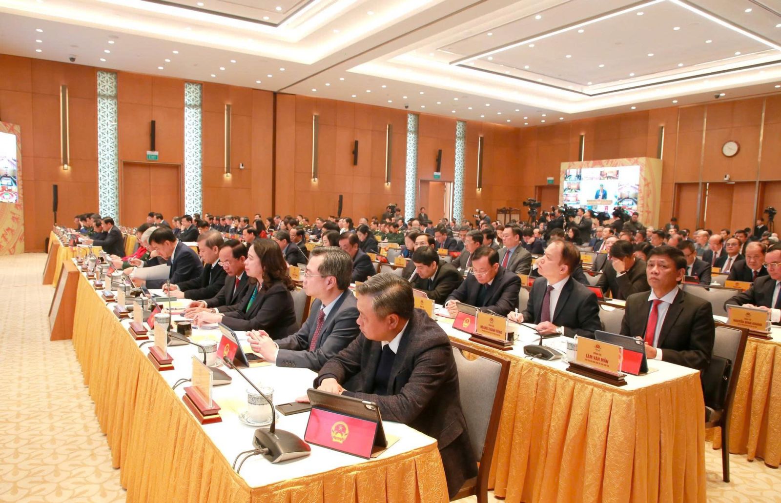 Các đồng chí Tổng Bí thư Tô Lâm, Chủ tịch nước Lương Cường; Chủ tịch Quốc hội Trần Thanh Mẫn; Thường trực Ban Bí thư Trần Cẩm Tú đến dự; Thủ tướng Chính phủ Phạm Minh Chính và Phó Thủ tướng Thường trực Chính phủ Trương Hòa Bình chủ trì Hội nghị.