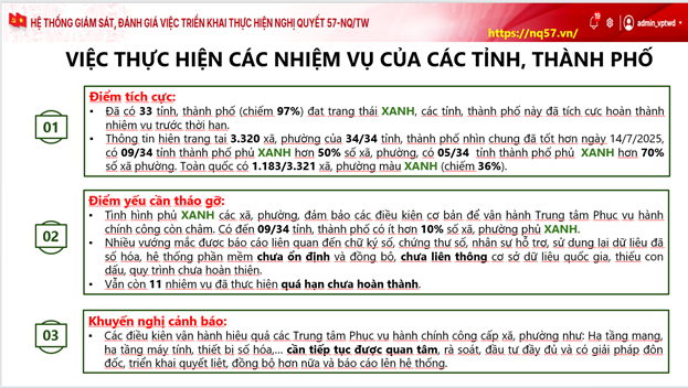 Xử lý nhiệm vụ quá hạn: Các Bộ, ban ngành, địa phương cần khẩn trương hoàn thành các nhiệm vụ đang thực hiện quá hạn và báo cáo lên Hệ thống giám sát, đánh giá việc triển khai thực hiện Nghị quyết số 57-NQ/TW (https://nq57.vn/).