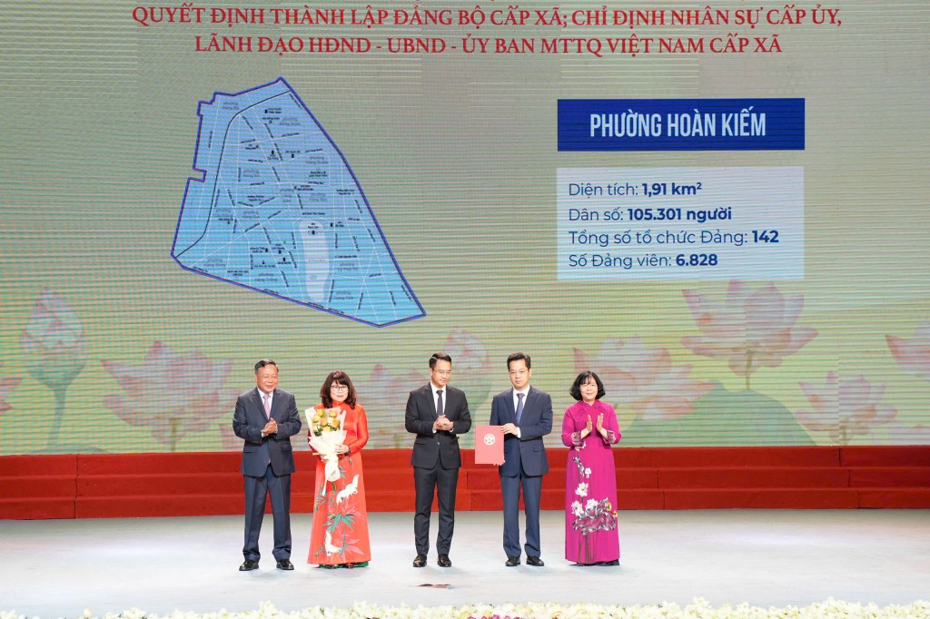 Bí thư Thành ủy Hà Nội Bùi thị Minh Hoài cùng phó Bí thư Thường trực Thành ủy Hà Nội Nguyễn Văn Phong trao quyết định tổ chức bộ máy và nhân sự cho các xã, phường mới.