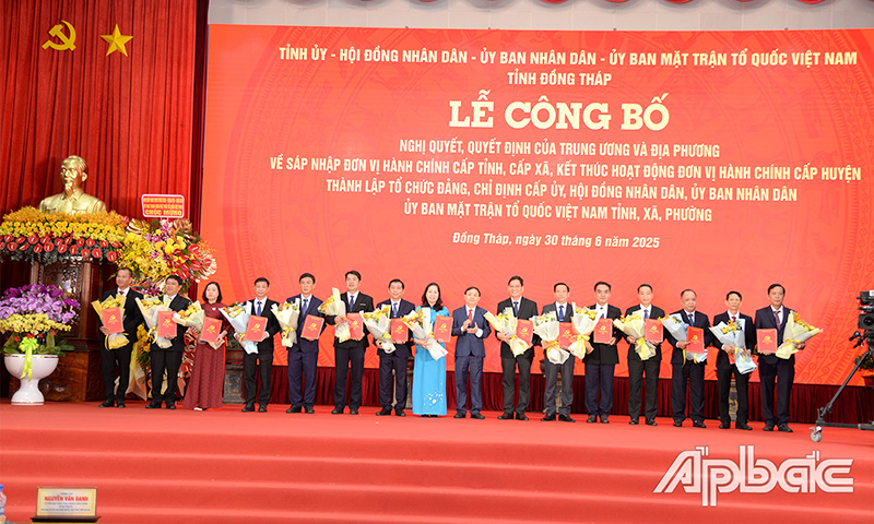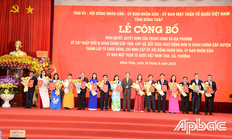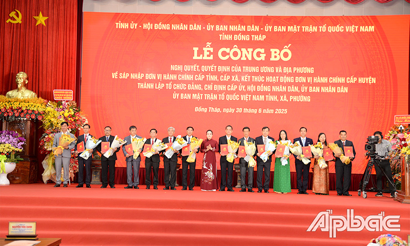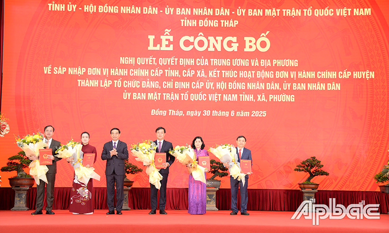 Sáng ngày 30/6, tại Hội trường Ấp Bắc, Trung tâm Hội nghị tỉnh, Tỉnh ủy - Hội đồng nhân dân - UBND - Ủy ban Mặt trận Tổ quốc Việt Nam tỉnh Đồng Tháp long trọng tổ chức Lễ công bố Nghị quyết, Quyết định của Trung ương và địa phương về sáp nhập đơn vị hành chính cấp tỉnh, cấp xã, kết thúc hoạt động đơn vị hành chính cấp huyện, thành lập tổ chức Đảng, chỉ định cấp ủy, Hội đồng nhân dân, UBND, Ủy ban Mặt trận Tổ quốc Việt Nam tỉnh, xã, phường.