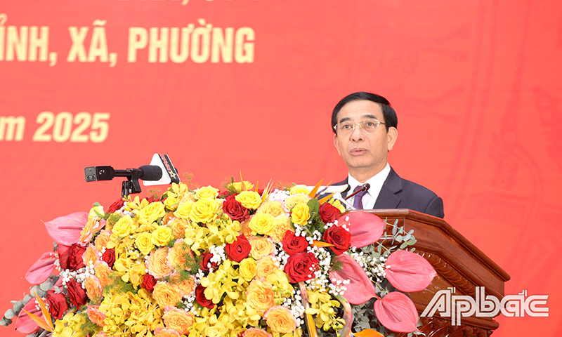 Phát biểu chỉ đạo, Đại tướng Phan Văn Giang, Ủy viên Bộ Chính trị, Bộ trưởng Bộ Quốc phòng đánh giá cao nỗ lực thực hiện chủ trương xây dựng chính quyền 2 cấp cũng như thực hiện chủ trương sáp nhập tỉnh của tỉnh Tiền Giang và Đồng Tháp. “Để có kết quả hôm nay, Trung ương ghi nhận và đánh giá cao tinh thần trách nhiệm, sự chia sẻ, ủng hộ, đồng lòng, đồng thuận cao của nhân dân tỉnh Tiền Giang và Đồng Tháp cũ trong thực hiện sáp nhập, hợp nhất, cũng như trong sắp xếp đơn vị hành chính cấp xã. Chính sự ủng hộ rất cao này của người dân là điều kiện quan trọng để quá trình chuẩn bị, triển khai đạt được cả tiến độ và chất lượng. Trung ương cũng đánh giá cao và ghi nhận tinh thần trách nhiệm vì sự nghiệp chung của nhiều đồng chí lãnh đạo các cấp, cán bộ, đảng viên, người lao động của hai tỉnh khi chủ động, tự nguyện xin nghỉ công tác trước thời hạn hoặc chấp hành tuyệt đối sự phân công, yêu cầu về công việc của tổ chức để quá trình sắp xếp bộ máy, đội ngũ cán bộ thuận lợi.