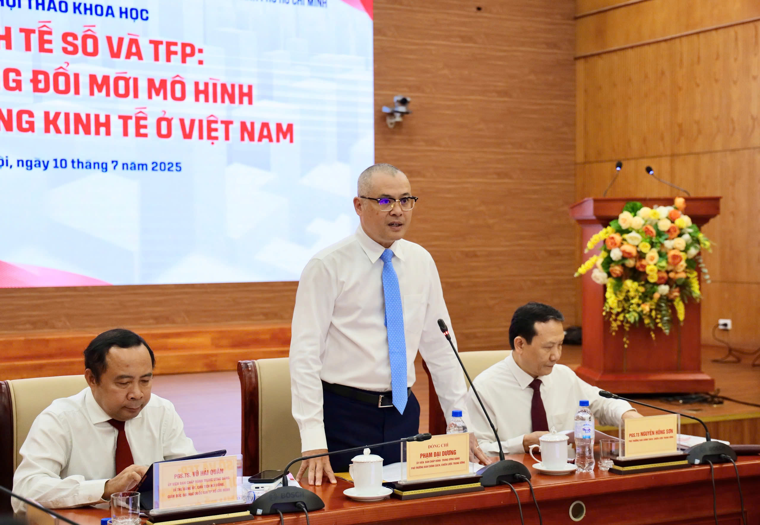 Phát biểu tại Hội thảo, đồng chí Vũ Hải Quân, Ủy viên Trung ương Đảng, Bí thư Đảng ủy, Giám đốc Đại học Quốc gia TP Hồ Chí Minh cho hay, Ban Chính sách, chiến lược Trung ương (trước đây là Ban Kinh tế Trung ương) và Đại học Quốc gia TP Hồ Chí Minh đã có quá trình hợp tác lâu dài trong nghiên cứu khoa học phục vụ phát triển kinh tế, xã hội của đất nước, tập trung vào các mô hình phát triển và tư vấn chính sách, đặc biệt là chính sách phát triển bền vững. Trong bối cảnh Nghị quyết số 57-NQ/TW đang được triển khai mạnh mẽ rộng khắp cả nước, lãnh đạo Ban Chính sách, chiến lược Trung ương và Đại học Quốc gia TP Hồ Chí Minh phối hợp tổ chức hội thảo nhằm làm rõ hơn vai trò của năng suất nhân tố tổng hợp (TFP) trong tăng trưởng kinh tế ở Việt Nam. Hội thảo thu hút sự quan tâm của các chuyên gia, nhà khoa học hàng đầu trong nước và khu vực.