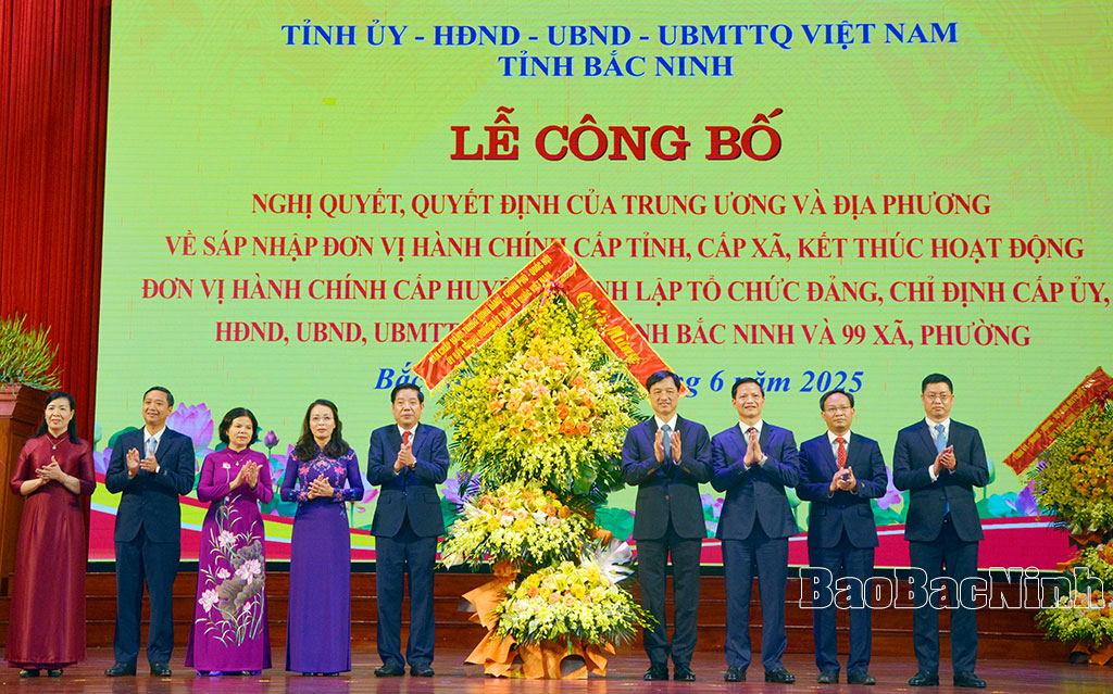 Sáng 30-6, Tỉnh ủy, HĐND, UBND, Ủy ban MTTQ tỉnh tổ chức Lễ công bố các Nghị quyết, Quyết định của Trung ương và địa phương về sáp nhập đơn vị hành chính cấp tỉnh, cấp xã, kết thúc hoạt động đơn vị hành chính cấp huyện, thành lập tổ chức đảng, chỉ định cấp ủy, HĐND, UBND, MTTQ tỉnh, xã, phường và Đoàn ĐBQH tỉnh. Hội nghị được tổ chức tại Trung tâm hội nghị tỉnh tại thành phố Bắc Giang và trực tuyến tới 99 điểm cầu xã, phường của tỉnh Bắc Ninh mới.