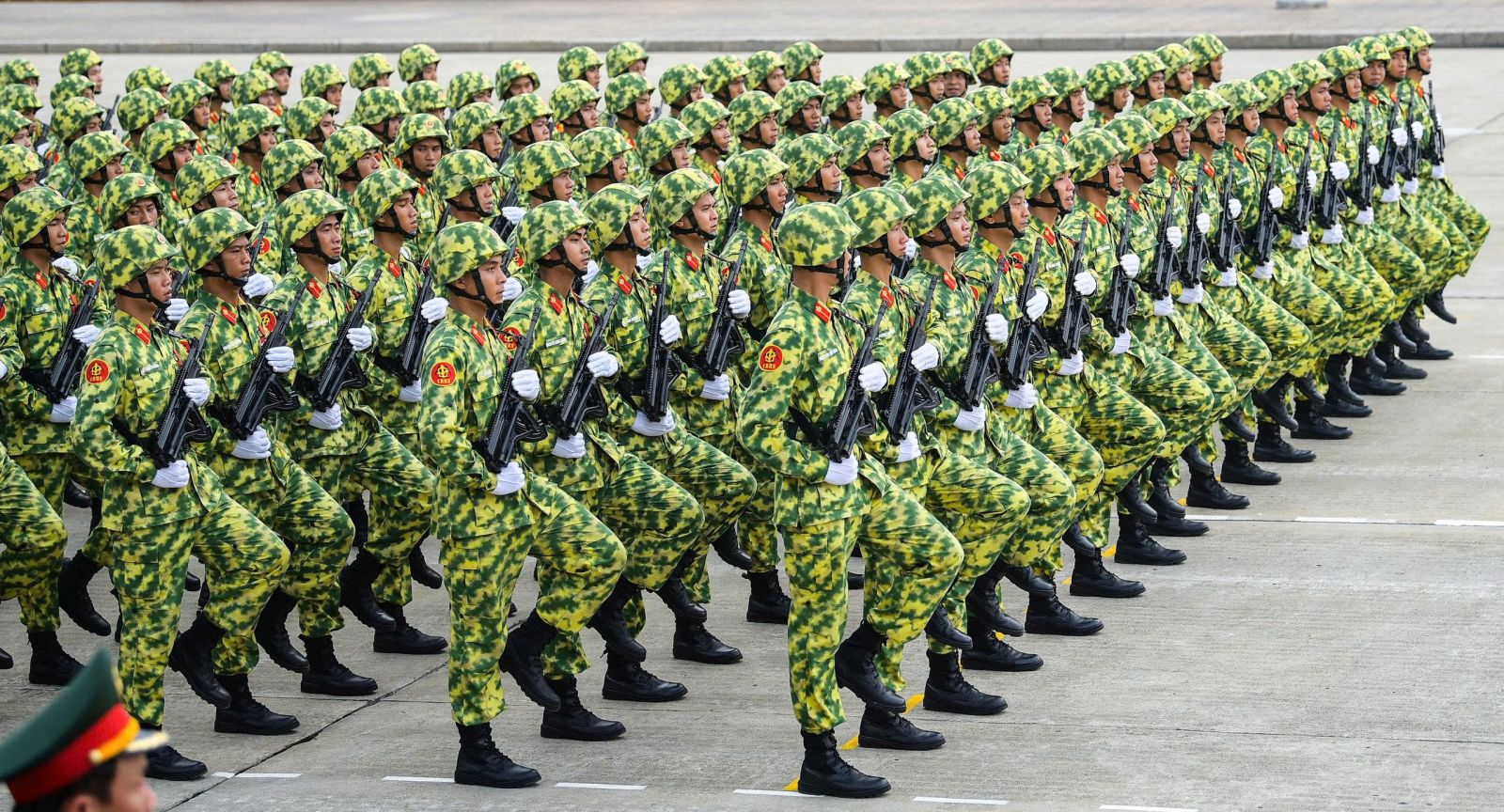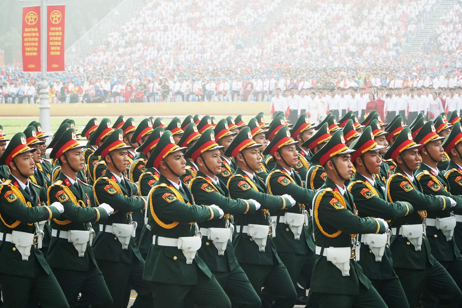 Tiếp đó, lần lượt các khối diễu binh, diễu hành tiến qua lễ đài Quảng trường Ba Đình. Khối quân đội có sự tham gia của: Khối danh dự ba quân chủng; Khối nữ Quân nhạc; Khối Sĩ quan Lục quân; Khối Sĩ quan Hải quân; Khối Sĩ quan Phòng không - Không quân; Khối Sĩ quan Biên phòng; Khối Sĩ quan Cảnh sát biển Việt Nam; Khối sĩ quan Hậu cần, Kỹ thuật, Công nghiệp quốc phòng; Khối nữ sĩ quan Quân y; Khối học viên các học viện nhà trường Quân đội; Khối chiến sĩ Tác chiến điện tử; Khối chiến sĩ đặc nhiệm dù; Khối lực lượng tác chiến không gian mạng; Khối nữ gìn giữ hoà bình Việt Nam; Khối chiến sĩ Tăng thiết giáp; Khối chiến sỹ Pháo binh – Tên lửa; Khối chiến sĩ Đặc công; Khối nữ chiến sĩ Biệt động; Khối chiến sĩ Công binh; Khối nữ chiến sĩ Thông tin; Khối chiến sĩ Phòng hoá.