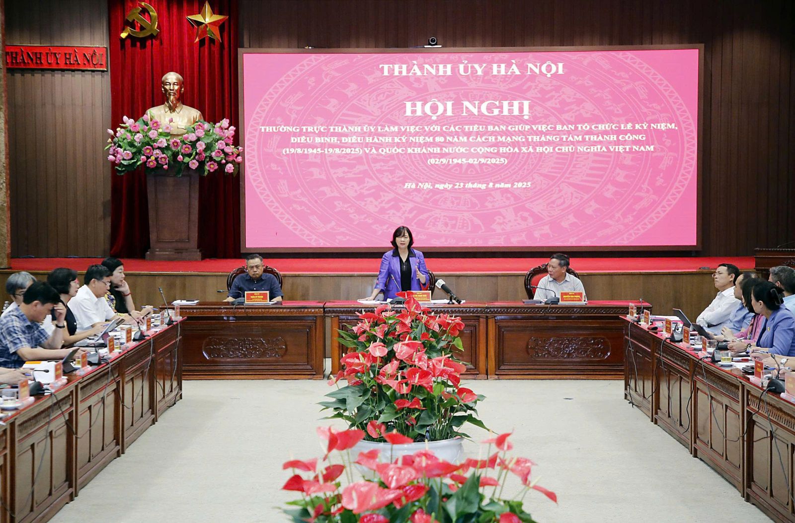 (ĐCSVN) - Đó là nhấn mạnh của đồng chí Bùi Thị Minh Hoài, Ủy viên Bộ Chính trị, Bí thư Thành ủy, Trưởng đoàn đại biểu Quốc hội thành phố Hà Nội tại buổi làm việc giữa Thường trực Thành ủy Hà Nội với các tiểu ban giúp việc Ban Tổ chức Lễ kỷ niệm, diễu binh, diễu hành kỷ niệm 80 năm Cách mạng Tháng Tám thành công (19/8/1945-19/8/2025) và Quốc khánh nước Cộng hòa xã hội chủ nghĩa Việt Nam (2/9/1945-2/9/2025) vào ngày 23/8.