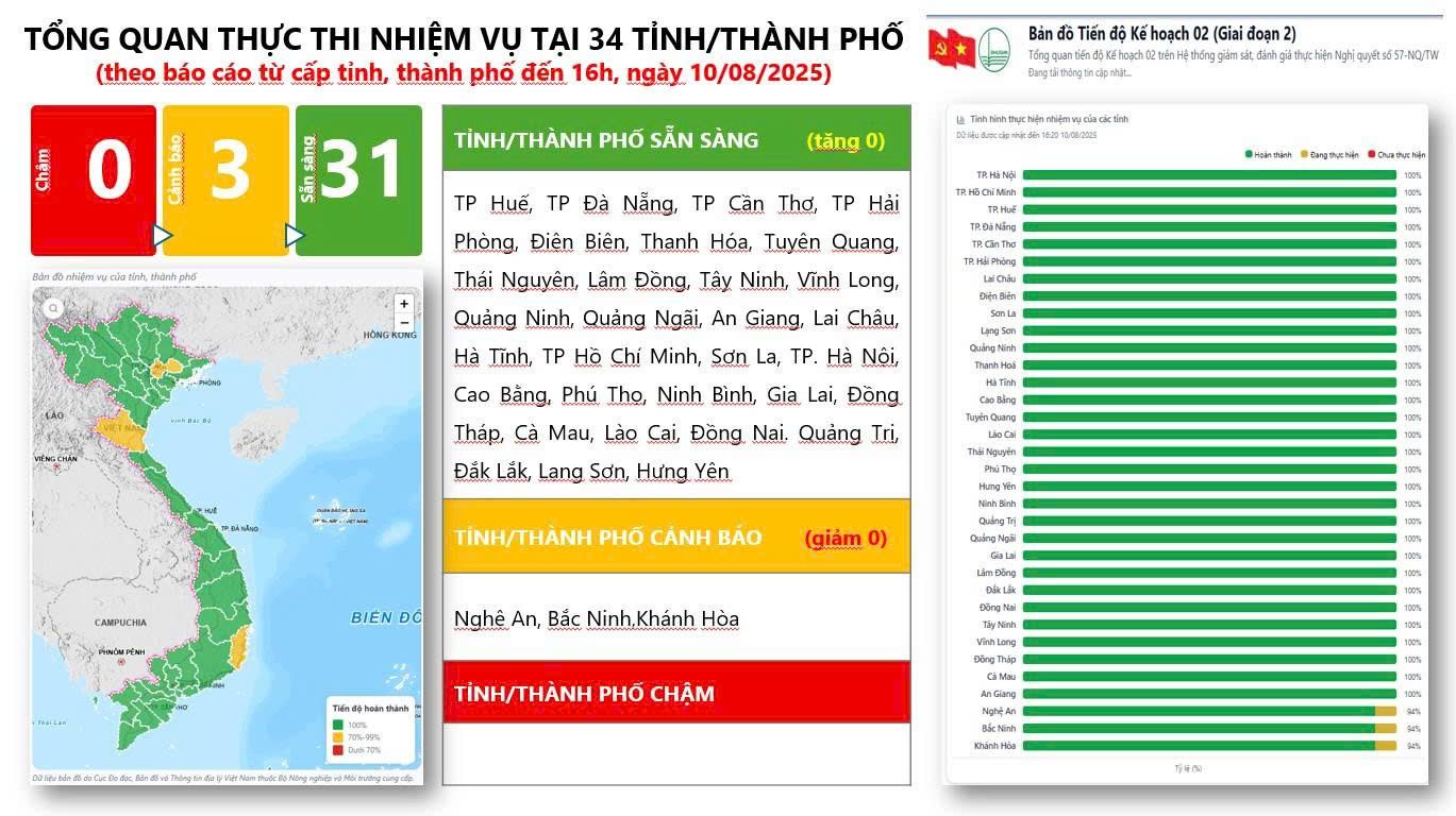 Theo bản đồ nhiệt giám sát của Trung tâm Chỉ huy Giám sát, điều hành, tính đến 16 giờ ngày 10/8/2025, công tác triển khai Kế hoạch số 02-KH/BCĐTW thực hiện Nghị quyết số 57-NQ/TW đã đạt những kết quả đáng ghi nhận.
