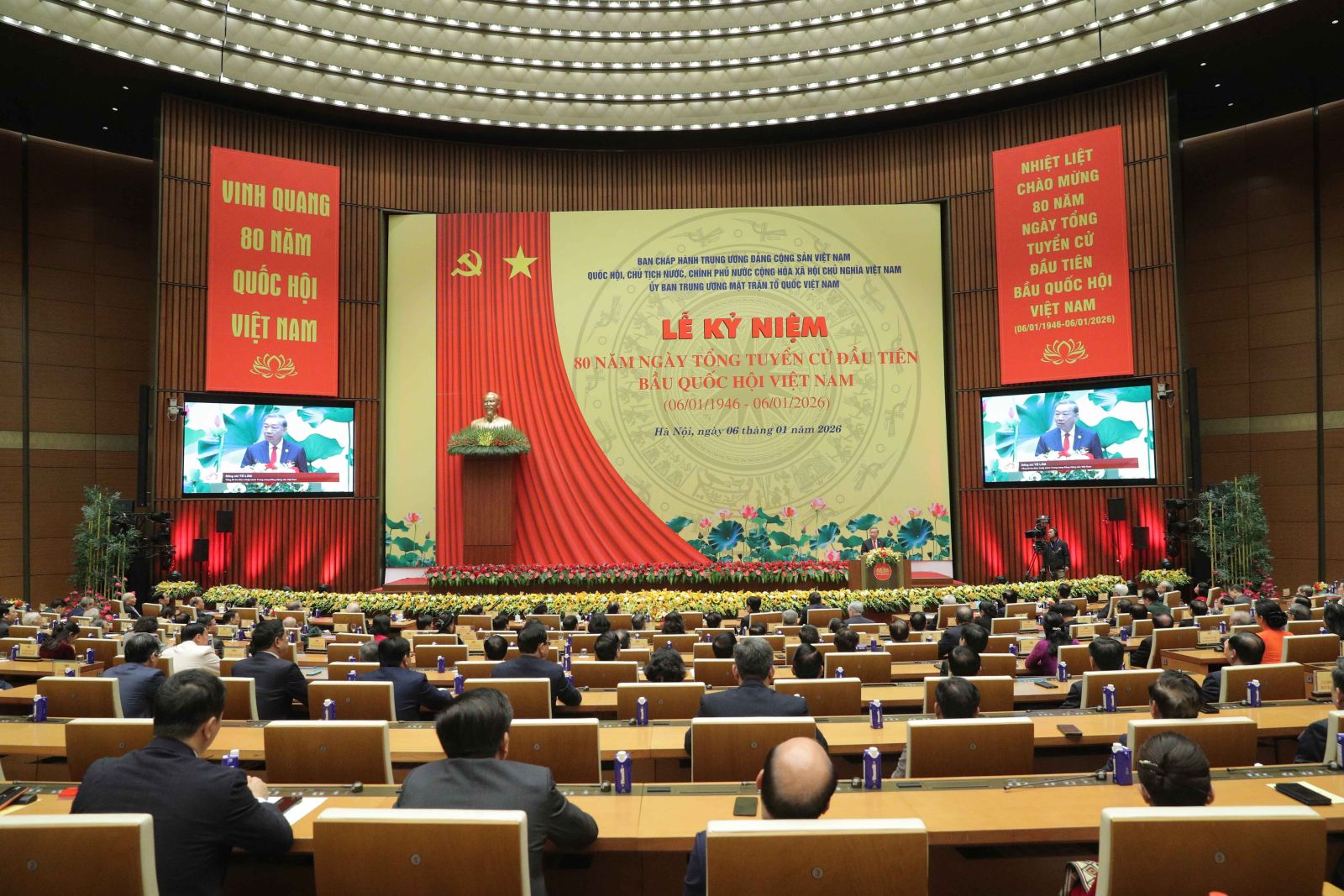 (ĐCSVN) - Sáng 6/1, tại Nhà Quốc hội, Ban Chấp hành Trung ương Đảng Cộng sản Việt Nam, Quốc hội, Chủ tịch nước, Chính phủ nước Cộng hòa xã hội chủ nghĩa Việt Nam và Ủy ban Trung ương Mặt trận Tổ quốc Việt Nam tổ chức trọng thể Lễ kỷ niệm cấp quốc gia 80 năm Ngày Tổng tuyển cử đầu tiên bầu Quốc hội Việt Nam (6/1/1946 - 6/1/2026). Tổng Bí thư Tô Lâm dự và phát biểu tại Lễ kỷ niệm.