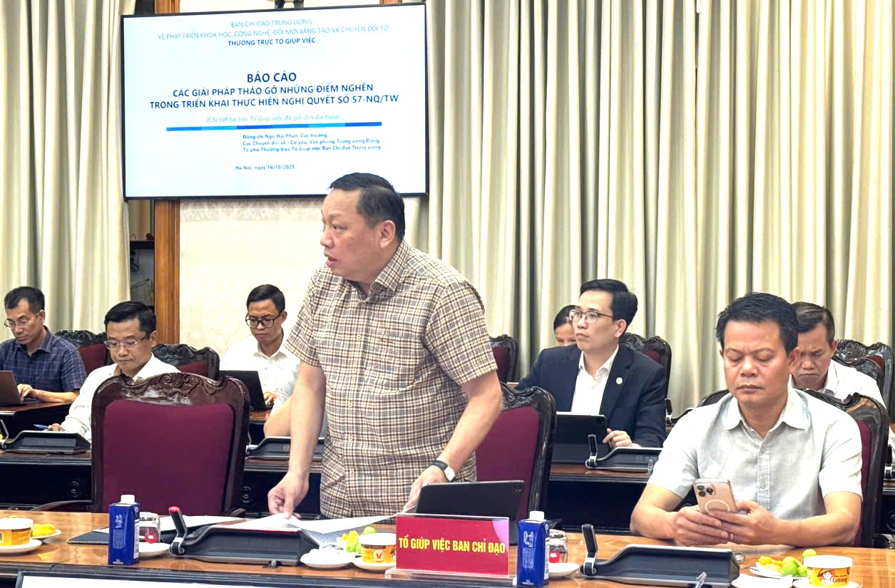 Báo cáo tại cuộc họp, đồng chí Ngô Hải Phan, Cục trưởng Cục Chuyển đổi số - Cơ yếu, Văn phòng Trung ương Đảng, Tổ phó Thường trực Tổ Giúp việc Ban Chỉ đạo Trung ương về phát triển khoa học, công nghệ, đổi mới sáng tạo và chuyển đổi số cho biết, cuộc họp được tổ chức nhằm phục vụ lãnh đạo Ban Chỉ đạo Trung ương thực hiện Nghị quyết số 57-NQ/TW và làm việc với các cơ quan liên quan để tháo gỡ những điểm nghẽn trong lĩnh vực khoa học, công nghệ, đổi mới sáng tạo và chuyển đổi số.