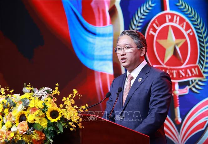 Bộ trưởng Bộ Tư pháp Nguyễn Hải Ninh trình bày diễn văn kỷ niệm 80 năm Ngày truyền thống ngành Tư pháp. Ảnh: Dương Giang/TTXVN