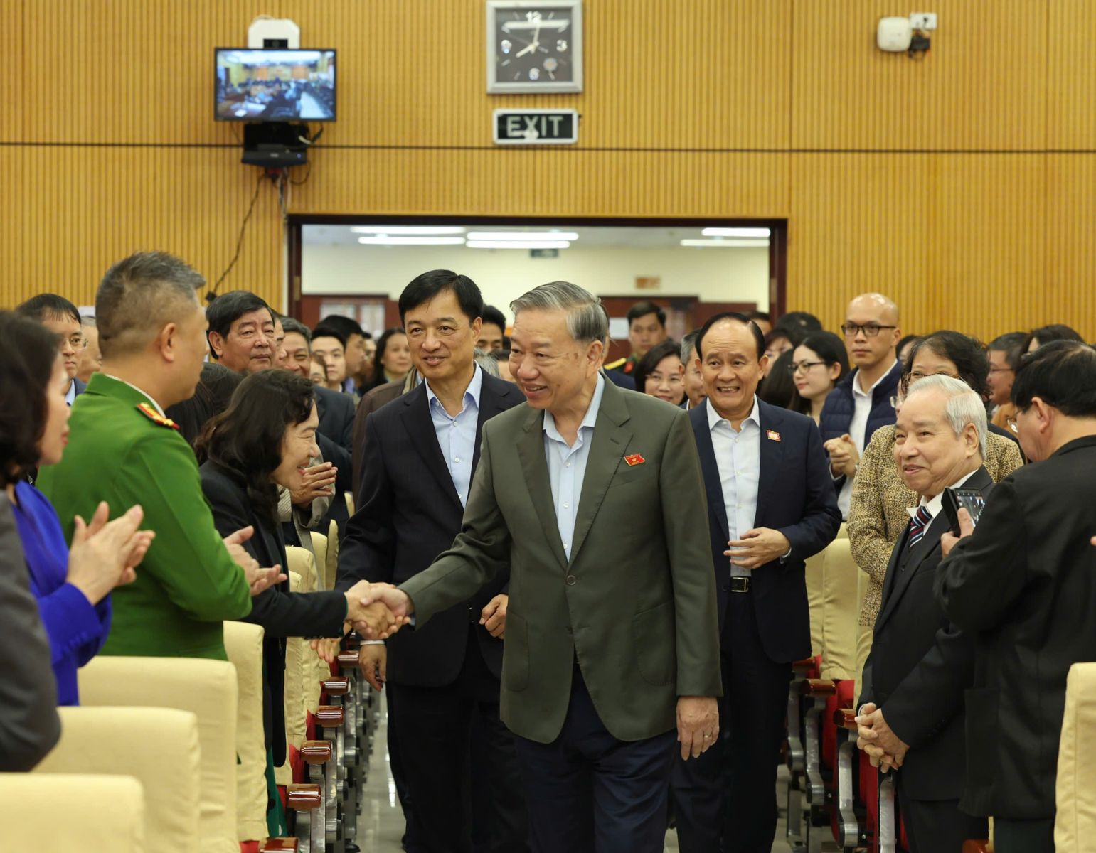 Tại buổi tiếp xúc, sau khi nghe đại diện đoàn ĐBQH TP. Hà Nội thông tin về những kết quả nổi bật của Kỳ họp thứ 10 và giải trình những ý kiến của cử tri gửi tới trước kỳ họp, các ý kiến của cử tri, thay mặt đoàn ĐBQH TP. Hà Nội, Tổng Bí thư Tô Lâm đánh giá cao các ý kiến của cử tri, qua đó cho thấy được khí thế và niềm tin của Nhân dân đối với các chủ trương, quyết sách lớn của Đảng, Nhà nước.