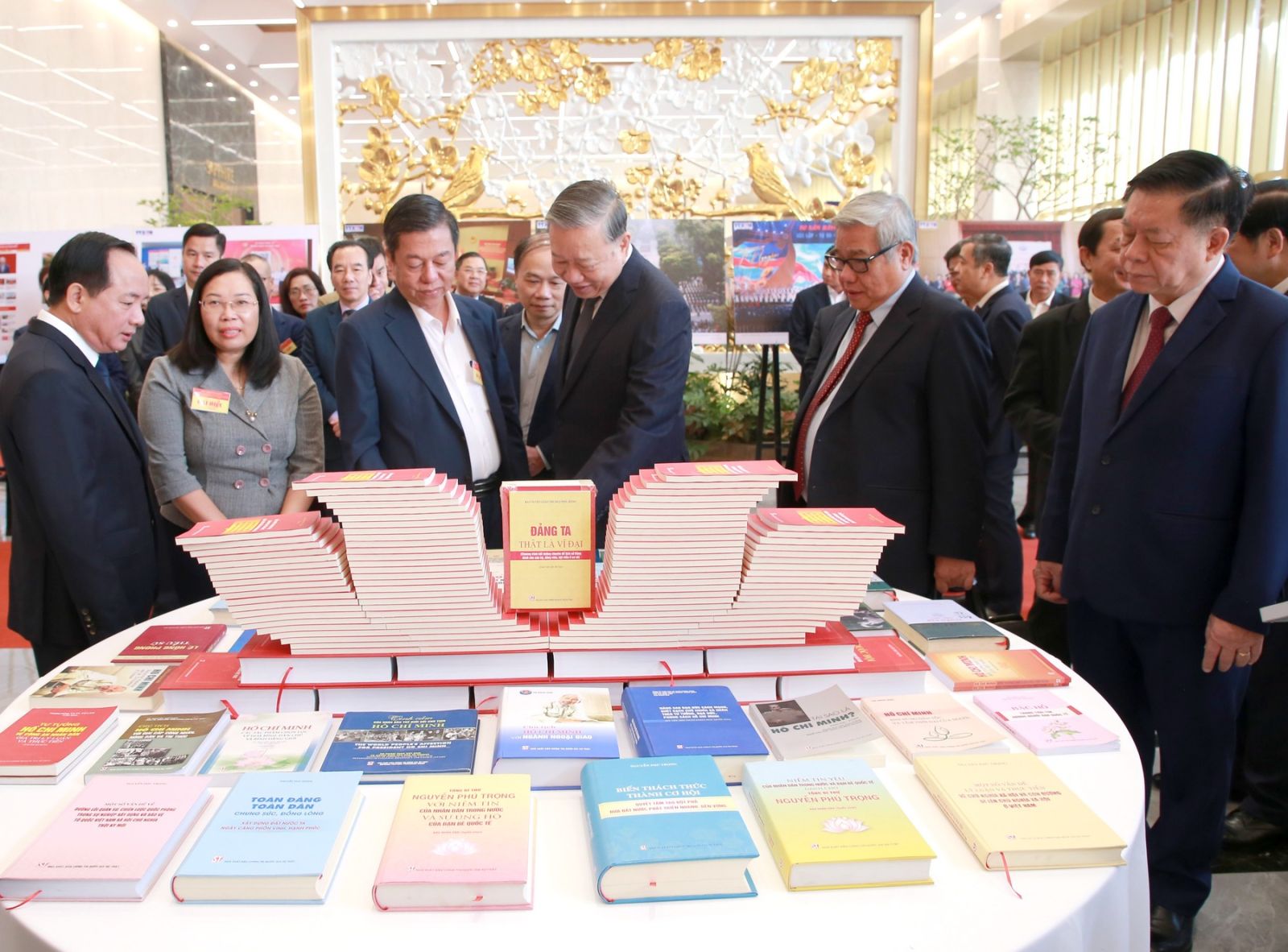 Tổng Bí thư Tô Lâm tham quan không gian trưng bày thành tựu xuất bản sách.