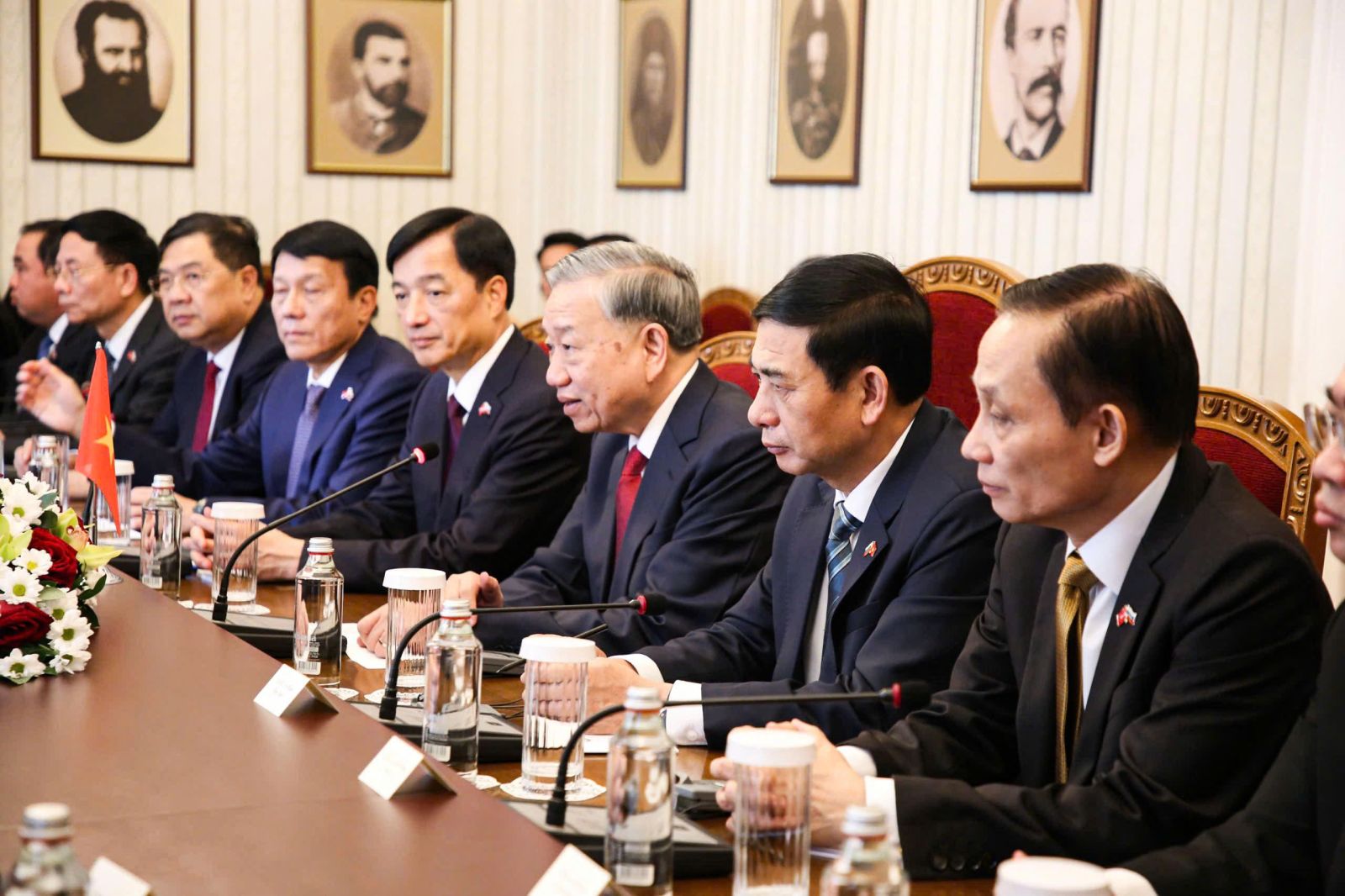 Tổng Bí thư Tô Lâm cảm ơn Tổng thống Rumen Radev về sự đón tiếp trọng thị, nồng hậu, thắm tình hữu nghị dành cho Đoàn đại biểu cấp cao Việt Nam và nhấn mạnh Việt Nam đặc biệt coi trọng quan hệ với Bulgaria, luôn ghi nhớ, trân trọng sự ủng hộ quý báu của nhân dân Bulgaria dành cho Việt Nam trong công cuộc đấu tranh giải phóng dân tộc, giành độc lập, thống nhất đất nước, cũng như trong xây dựng và phát triển đất nước.