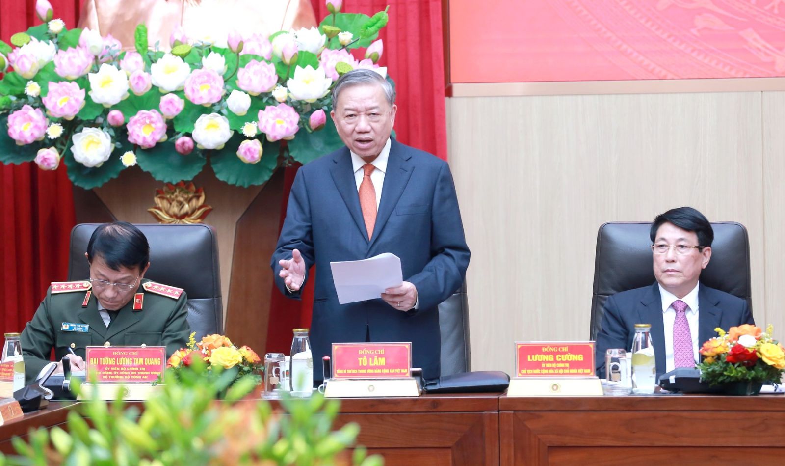 Các đồng chí: Chủ tịch nước Lương Cường, Ủy viên Ban Thường vụ Đảng ủy Công an Trung ương; Thủ tướng Chính phủ Phạm Minh Chính, Ủy viên Ban Thường vụ Đảng ủy Công an Trung ương dự và phát biểu chỉ đạo.