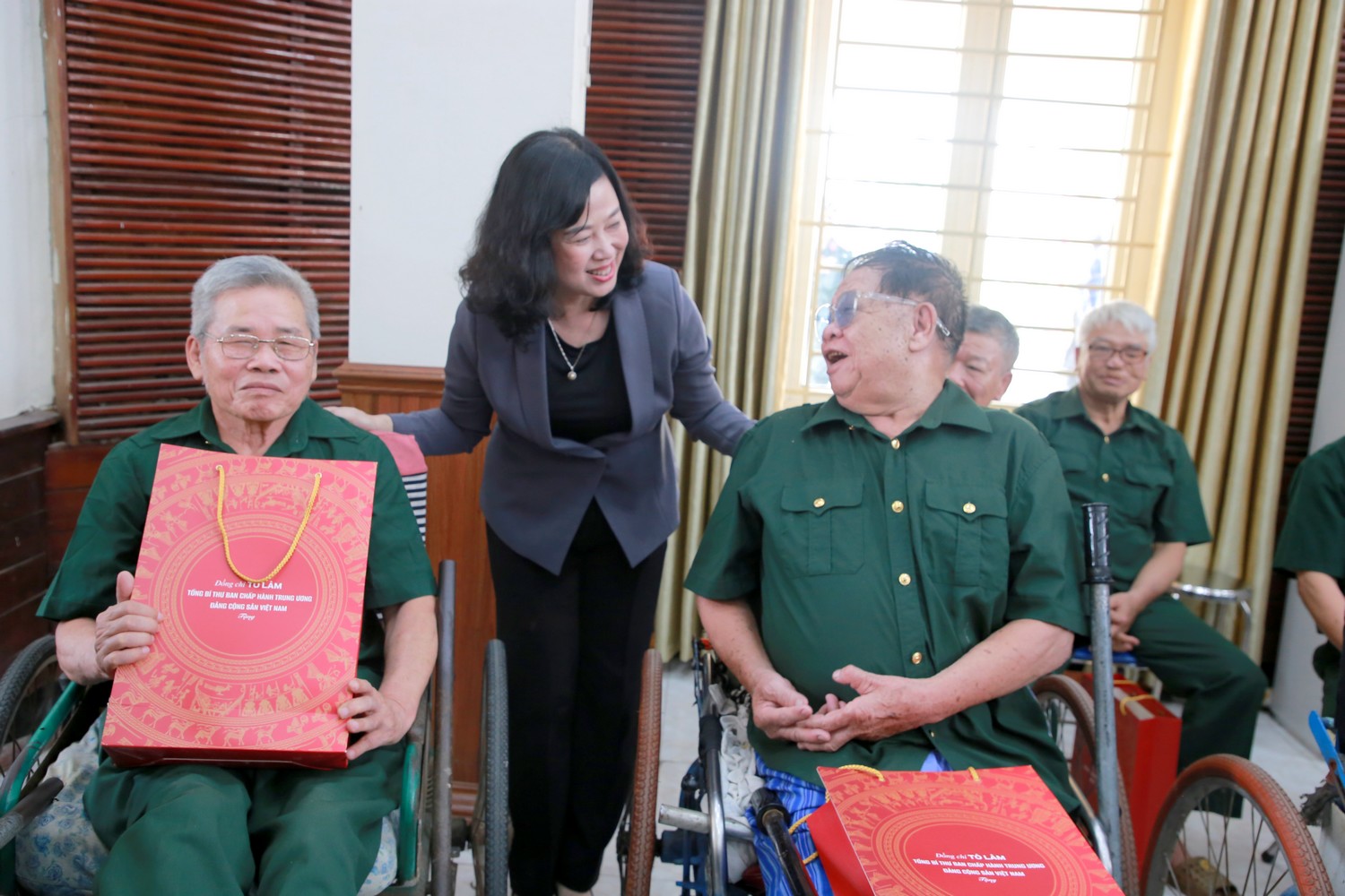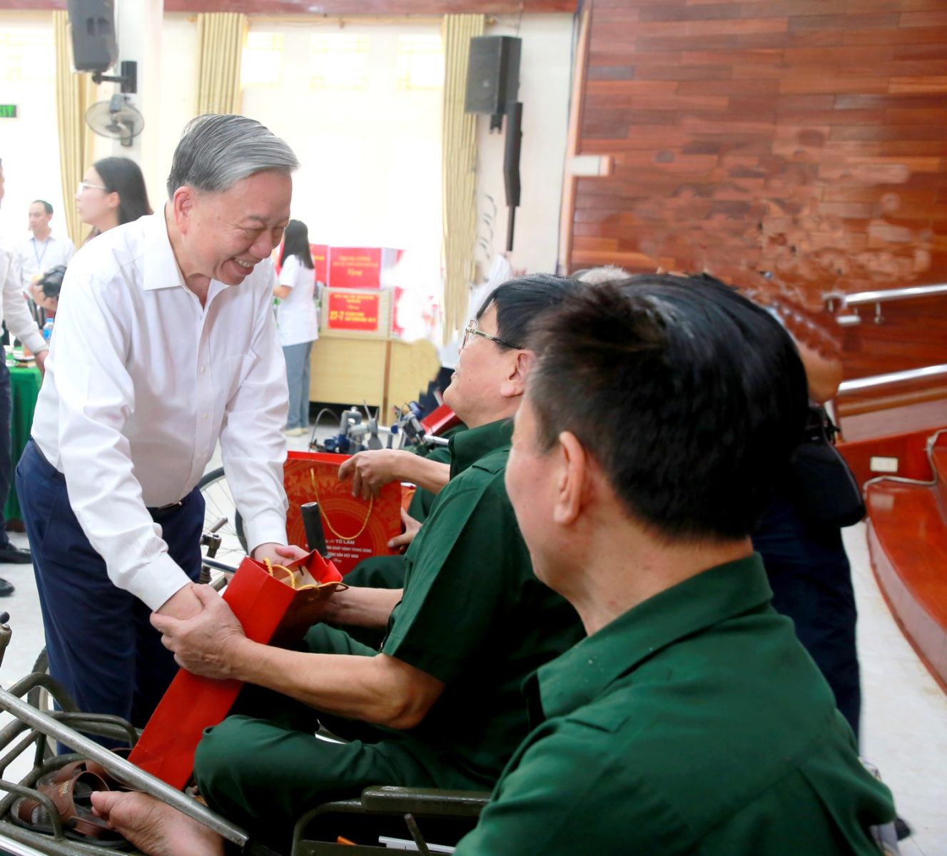 Tổng Bí thư Tô Lâm tặng quà các đồng chí thương binh, bệnh binh tại Trung tâm điều dưỡng thương binh Thuận Thành, Bắc Ninh.