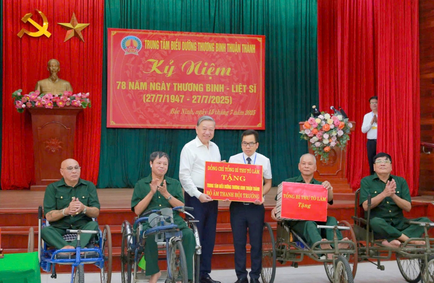 (ĐCSVN) - Chiều 15/7, nhân dịp kỷ niệm 78 năm ngày Thương binh - Liệt sỹ (27/7/1947-27/7/2025), Tổng Bí thư Tô Lâm và đoàn công tác Trung ương đã tới thăm, tặng quà thương bệnh binh, cán bộ, nhân viên Trung tâm điều dưỡng thương binh Thuận Thành, Bắc Ninh.