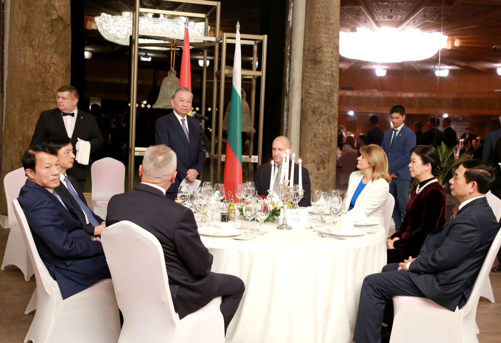 Tối cùng ngày, Tổng thống Cộng hòa Bulgaria Rumen Radev và Phu nhân đã chủ trì tiệc chiêu đãi chính thức Tổng Bí thư Tô Lâm và Phu nhân cùng Đoàn đại biểu cấp cao Việt Nam. Phát biểu tại đây, Tổng Bí thư Tô Lâm và Tổng thống Cộng hòa Bulgaria Rumen Radev đều khẳng định, sau 75 năm kể từ khi thiết lập quan hệ ngoại giao năm 1950 đến nay, Việt Nam và Bulgaria đã xây dựng và phát triển mối quan hệ hữu nghị truyền thống và hợp tác nhiều mặt tốt đẹp trên cơ sở tin cậy, bình đẳng, tôn trọng lẫn nhau, vì lợi ích của nhân dân hai nước. Hai nhà lãnh đạo bày tỏ vui mừng về kết quả tốt đẹp của chuyến thăm và làm việc lần này của Tổng Bí thư Việt Nam Tô Lâm tại Bulgaria và cho biết, hai bên đã nhất trí thông qua Tuyên bố chung về việc nâng cấp quan hệ Việt Nam - Bulgaria lên “Đối tác chiến lược”. Việc thiết lập khuôn khổ quan hệ Đối tác chiến lược Việt Nam - Bulgaria nhằm đưa quan hệ hai nước lên một tầm cao mới trên cả bình diện song phương và đa phương, tăng cường và củng cố các cơ chế hợp tác song phương hiện có, cũng như thúc đẩy hình thành các cơ chế mới nhằm làm sâu sắc hơn hợp tác giữa hai nước.
