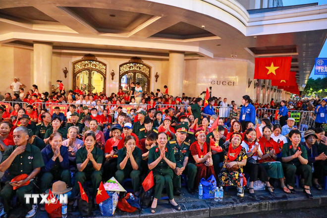 Dọc phố Nguyễn Thái Học, người dân ngồi kín hai bên đường, dõi theo từng khối diễu hành. Gương mặt ai cũng bừng sáng với nụ cười nở trên môi.