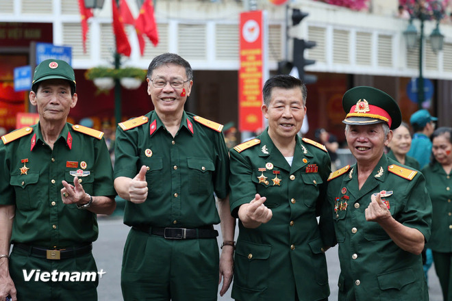 Khoác trên mình bộ quân phục đã cũ, ông và vợ cùng đứa cháu nội 7 tuổi, mỗi người cầm trên tay 1 lá cờ Tổ quốc đỏ thắm, mắt dõi theo từng khối diễu hành đi qua, rưng rưng xúc động.