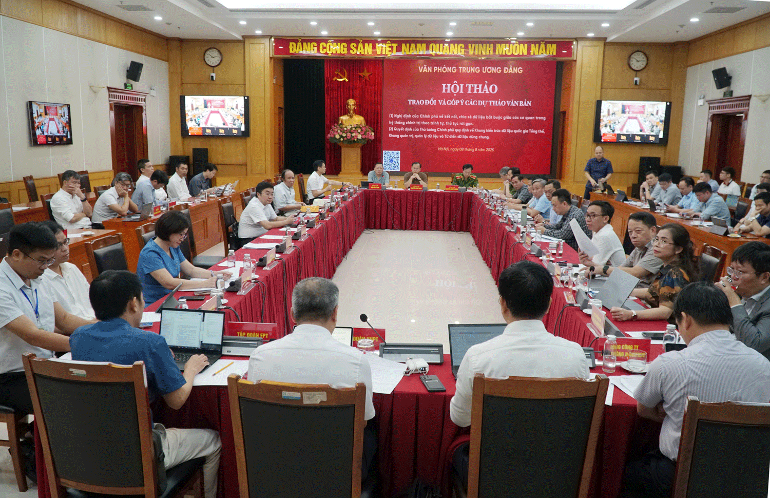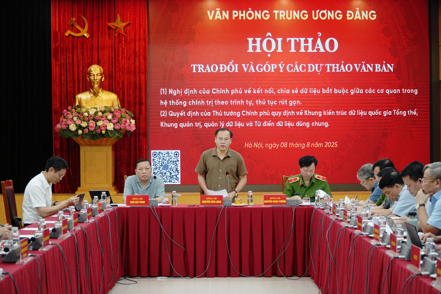 (ĐCSVN) - Sáng 8/8, Văn phòng Trung ương Đảng – Cơ quan Thường trực Ban Chỉ đạo Trung ương về phát triển khoa học, công nghệ, đổi mới sáng tạo và chuyển đổi số tổ chức Hội thảo để trao đổi, góp ý vào Dự thảo Nghị định của Chính phủ về kết nối, chia sẻ dữ liệu bắt buộc giữa các cơ quan trong hệ thống chính trị theo trình tự, thủ tục rút gọn và Dự thảo Quyết định của Thủ tướng Chính phủ quy định về Khung kiến trúc dữ liệu quốc gia Tổng thể, Khung quản trị, quản lý dữ liệu và Từ điển dữ liệu dùng chung.