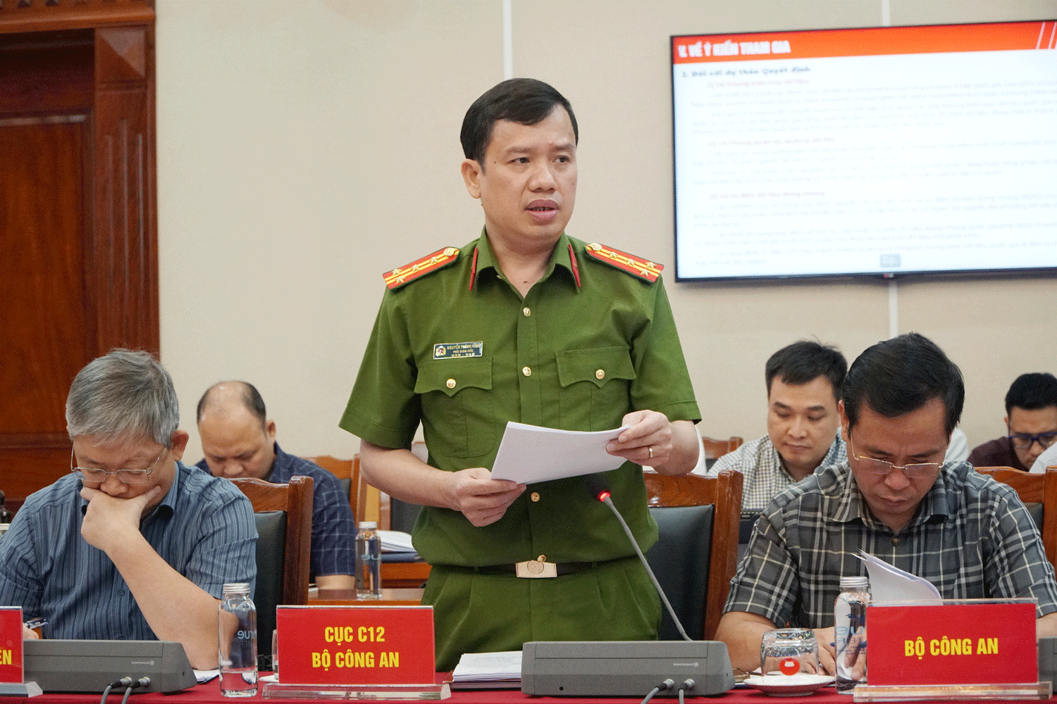 Đại tá Nguyễn Thành Vĩnh - Phó Giám đốc Trung tâm dữ liệu quốc gia trình bày báo cáo về quá trình xây dựng 2 bản dự thảo