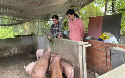 Bà Thái Thị Hồng (bên trái) ứng dụng khoa học, kỹ thuật, đạt hiệu quả trong nuôi heo. Ảnh: CẨM TÚ