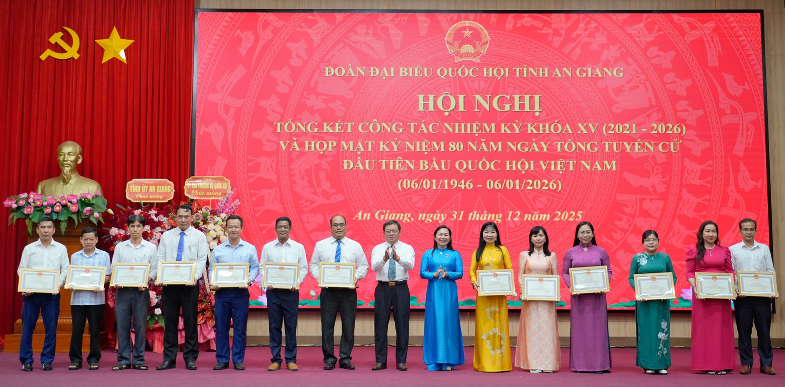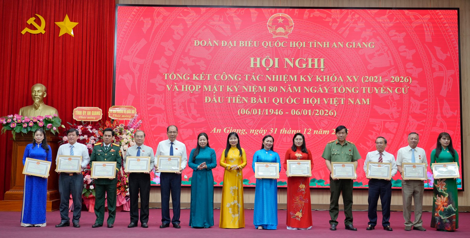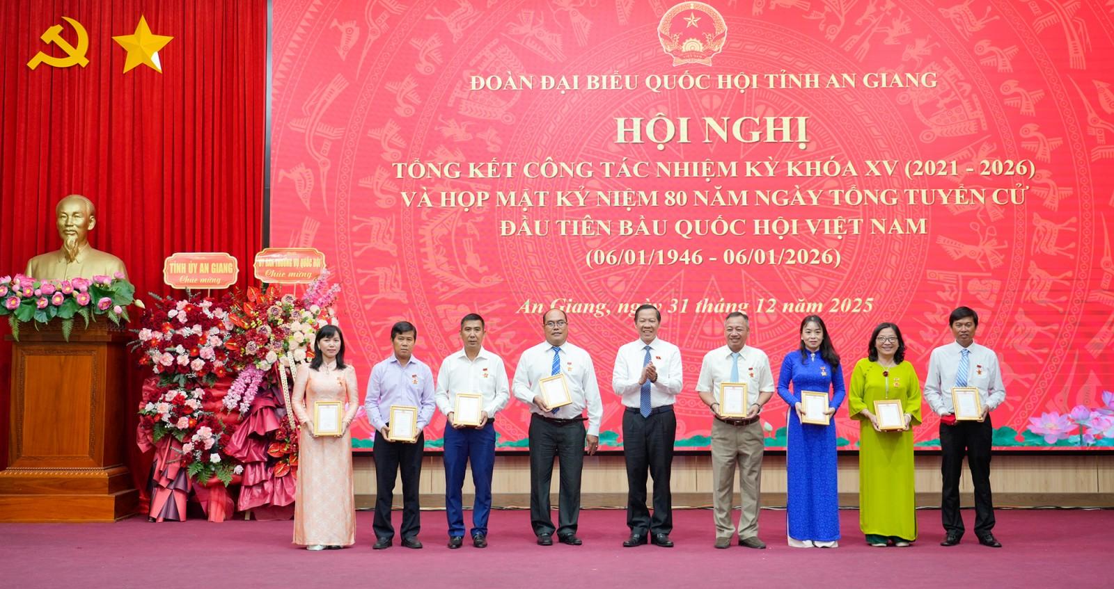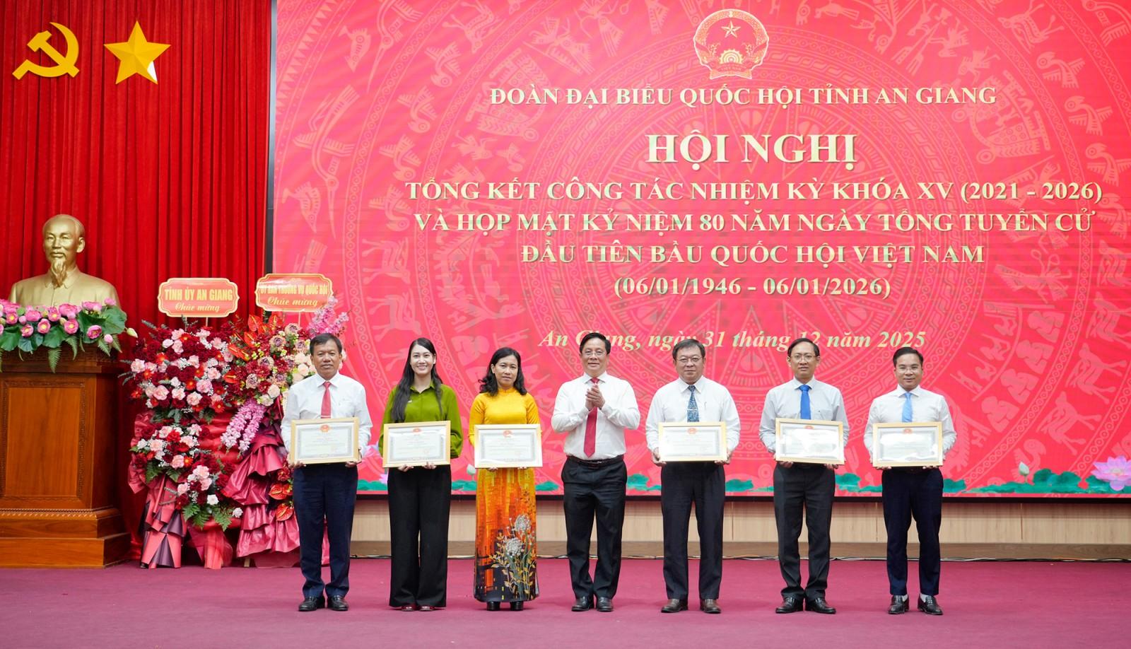 Dịp này, Ủy ban Thường vụ Quốc hội tặng Kỷ niệm chương “Vì sự nghiệp Quốc hội Việt Nam” cho 9 công chức và nhân viên Văn phòng Đoàn đại biểu Quốc hội và HĐND tỉnh An Giang. Chủ tịch UBND tỉnh An Giang tặng bằng khen cho 6 cá nhân có thành tích xuất sắc trong vận động đóng góp vật chất và kinh phí thực hiện hiệu quả công tác an sinh xã hội trên địa bàn tỉnh An Giang nhiệm kỳ 2021 - 2026; tặng bằng khen 9 tập thể, 29 cá nhân có thành tích xuất sắc trong thực hiện nhiệm vụ đại biểu Quốc hội; công tác phối hợp, tham mưu và phục vụ các hoạt động của Đoàn Đại biểu Quốc hội tỉnh An Giang, nhiệm kỳ 2021 - 2026.