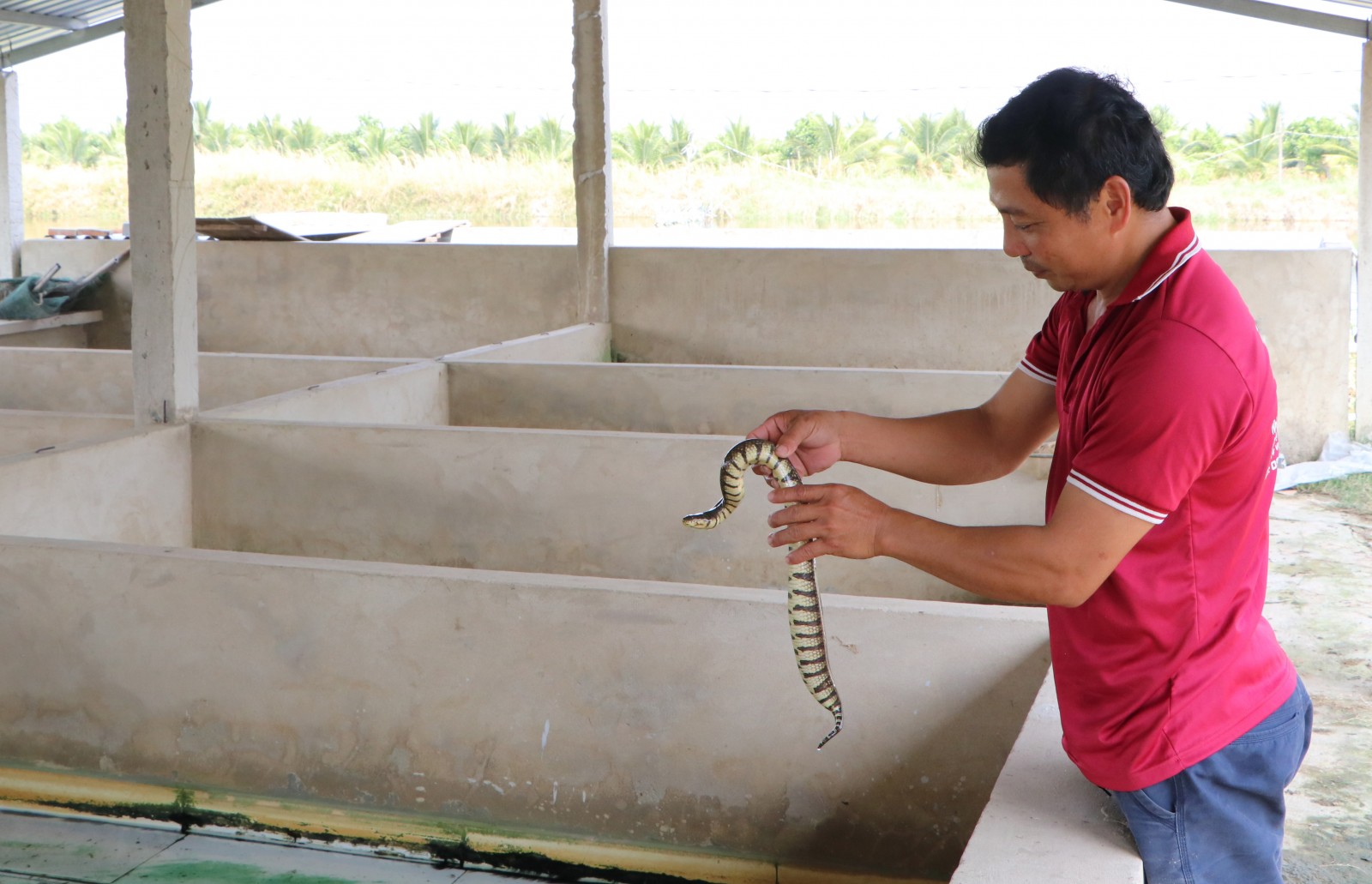 Anh Võ Hoàng Vĩnh kiểm tra rắn ri voi trong bể nuôi. Ảnh: TIỂU ĐIỀN