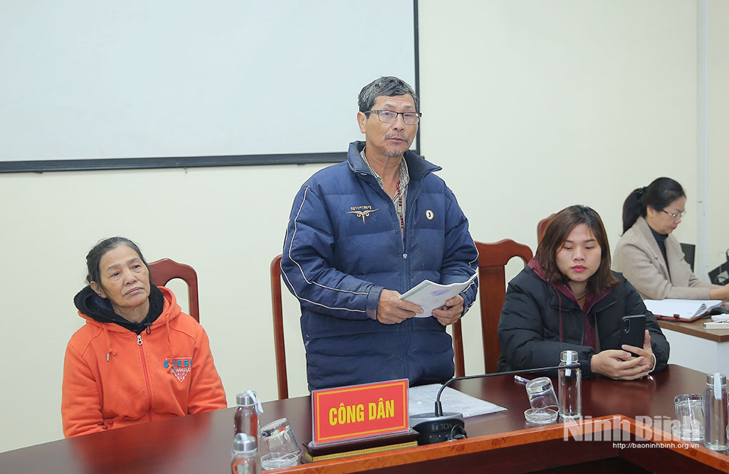 Tại phiên tiếp công dân, đại diện lãnh đạo các sở, ngành, địa phương có liên quan đã thông báo quá trình giải quyết đề nghị cấp Giấy chứng nhận quyền sử dụng đất của ông Trần Văn Ngọc, xóm Cồn Thoi 4, xã Bình Minh; kiến nghị của một số công dân Tổ dân phố Quang Ấm, phường Hà Nam liên quan đến việc thu hồi, hỗ trợ giải phóng mặt bằng khi Nhà nước thu hồi đất thực hiện dự án Đầu tư xây dựng Khu đô thị sinh thái Bắc Châu Giang.
