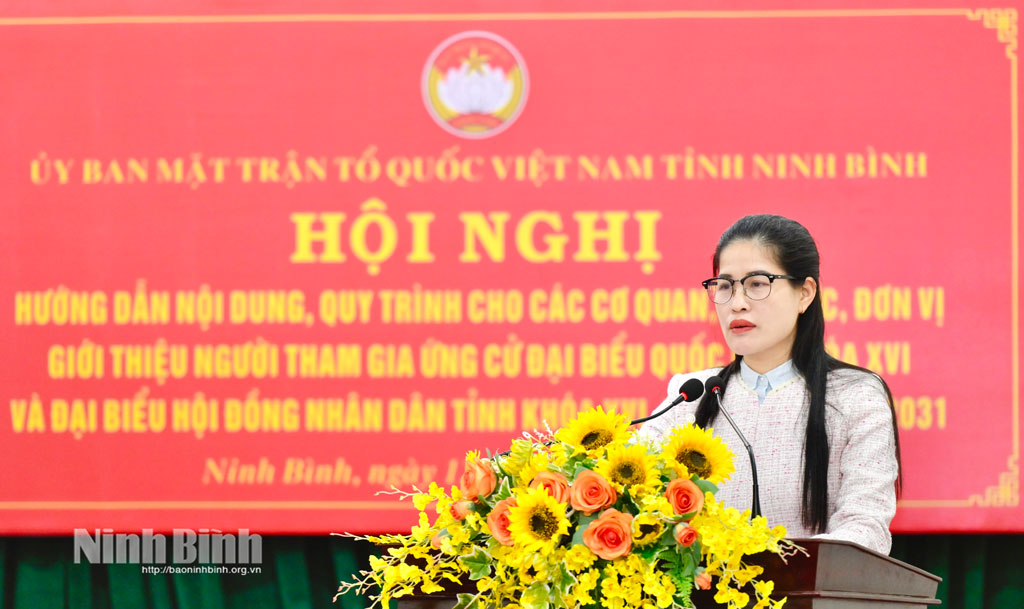 Tại hội nghị, lãnh đạo Ủy ban MTTQ Việt Nam tỉnh đã hướng dẫn nội dung, quy trình 03 bước trong việc giới thiệu người ứng cử, bao gồm: Họp ban lãnh đạo cơ quan, tổ chức, đơn vị để dự kiến người giới thiệu ứng cử; Tổ chức hội nghị lấy ý kiến cử tri nơi công tác để người ứng cử nhận được sự tín nhiệm của cử tri tại đơn vị; Tổ chức hội nghị ban lãnh đạo mở rộng để thảo luận, giới thiệu chính thức người ứng cử. Đồng thời, lãnh đạo Ủy ban MTTQ Việt Nam tỉnh và đại diện Ủy ban Bầu cử tỉnh hướng dẫn làm hồ sơ ứng cử, thời gian nộp hồ sơ; thảo luận, giải đáp, làm rõ ý kiến của các đại biểu và những nội dung còn vướng mắc trong quá trình triển khai.