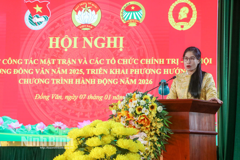 Phát biểu tại buổi tổng kết, đồng chí Trần Thị Thoa, Phó Chủ tịch Ủy ban MTTQ Việt Nam tỉnh đã báo cáo sơ bộ một số chỉ tiêu cơ bản về thành tựu phát triển kinh tế - xã hội của tỉnh và hệ thống MTTQ, các tổ chức chính trị - xã hội của tỉnh trong năm 2025. Đồng thời ghi nhận, biểu dương những kết quả công tác Mặt trận và các tổ chức chính trị - xã hội phường Đồng Văn đã đạt được. Đồng chí đề nghị Ban Thường trực Ủy ban MTTQ và Ban Thường vụ các hội, đoàn thể của phường tiếp tục phát huy kết quả đạt được; thường xuyên bám sát chỉ đạo cấp ủy, chính quyền để phối hợp thực hiện nhiệm vụ đạt kết quả cao, toàn diện. Trước mắt, tập trung tuyên truyền về Đại hội XIV của Đảng và bầu cử đại biểu Quốc hội khoá XVI và đại biểu HĐND các cấp nhiệm kỳ 2026-2031. Cùng với đó, phối hợp các cấp, ngành triển khai thực hiện hiệu quả 17 chỉ tiêu phát triển kinh tế - xã hội của phường năm 2026.