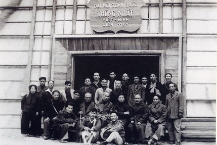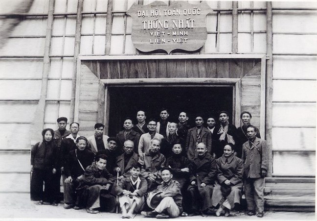 | Chủ tịch Hồ Chí Minh, đồng chí Tôn Đức Thắng, cùng các đại biểu chụp ảnh lưu niệm tại Hội trường tổ chức Đại hội toàn quốc thống nhất Việt Minh - Hội Liên Việt. (Ảnh tư liệu) |