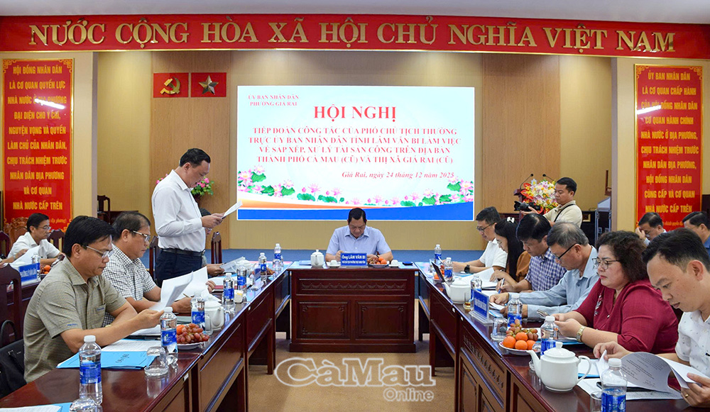 Chiều 24/12, tại phường Giá Rai, Đoàn công tác của UBND tỉnh do đồng chí Lâm Văn Bi, Uỷ viên Ban Thường vụ Tỉnh uỷ, Phó Chủ tịch Thường trực UBND tỉnh, Trưởng Ban Chỉ đạo rà soát, sắp xếp, xử lý tài sản công là nhà, đất dôi dư trên địa bàn tỉnh, làm Trưởng đoàn, có buổi làm việc với các xã, phường khu vực TP Cà Mau (cũ) và thị xã Giá Rai (cũ) về công tác sắp xếp, xử lý tài sản công.